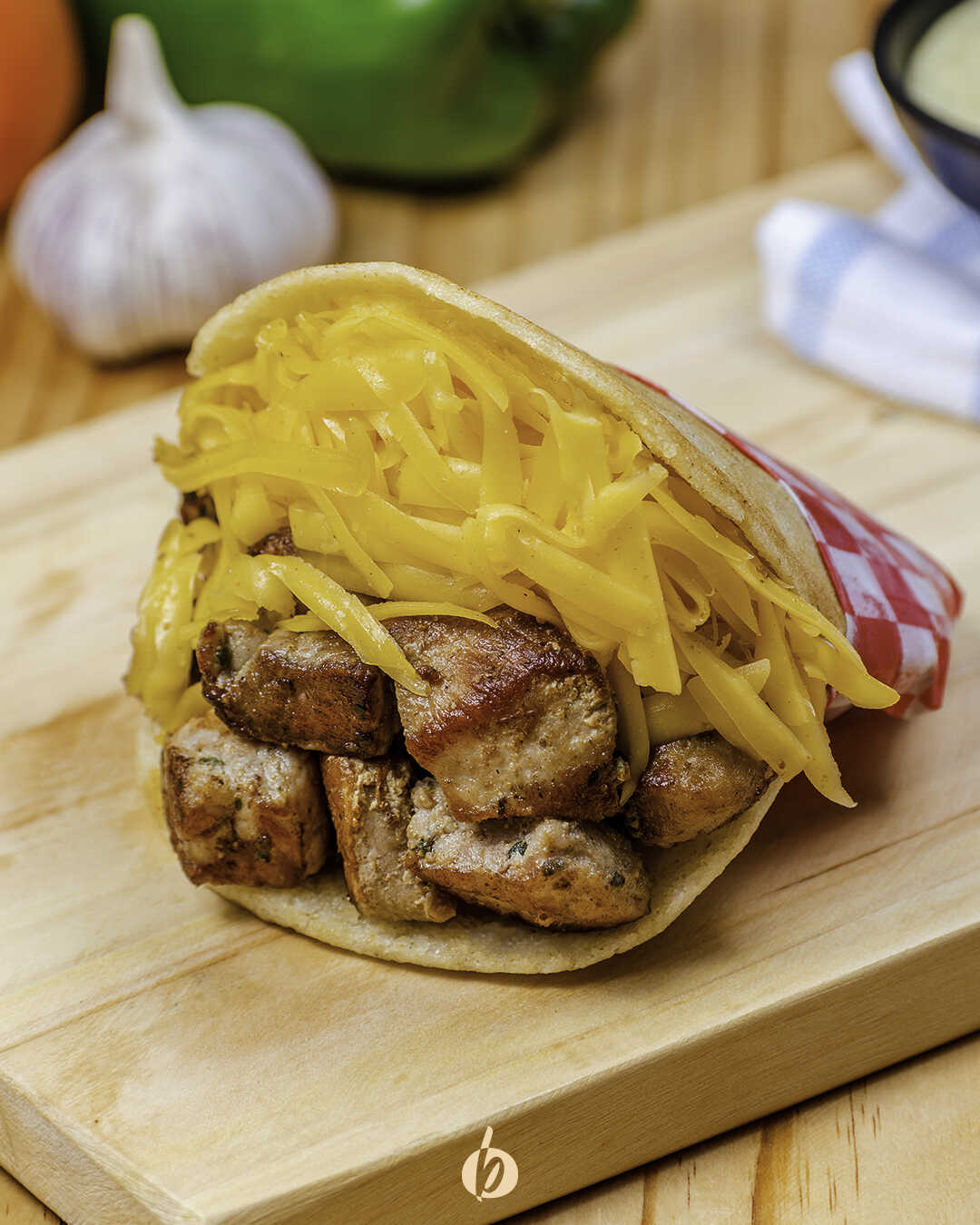 Tortilla de maíz, queso de mano y adición de proteína.