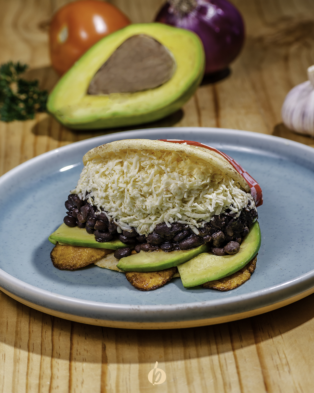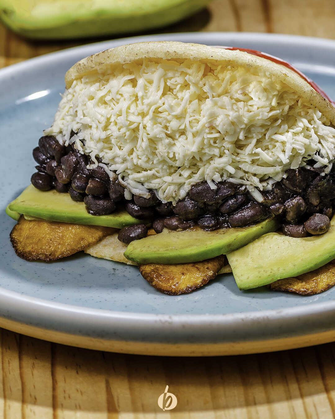 Arepa asada con tajadas de maduro, aguacate, caraota negra y queso campesino .