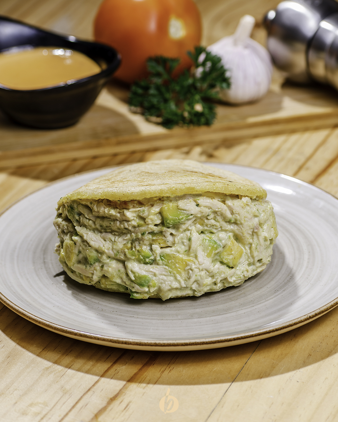 Arepa asada con mezcla de pollo desmechado, aguacate y salsa de la casa. (Relleno a temperatura ambiente)