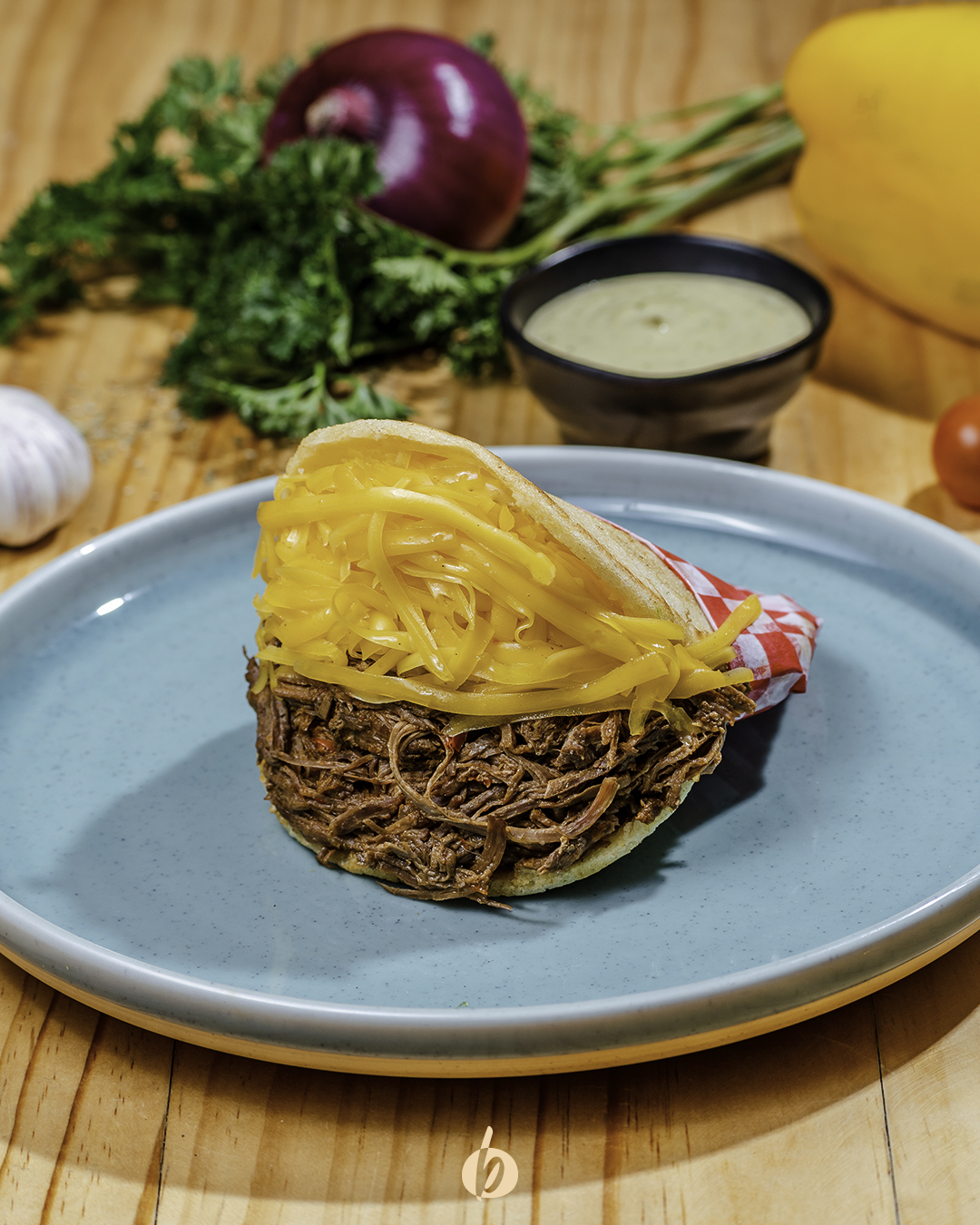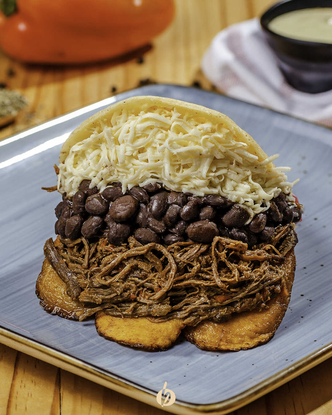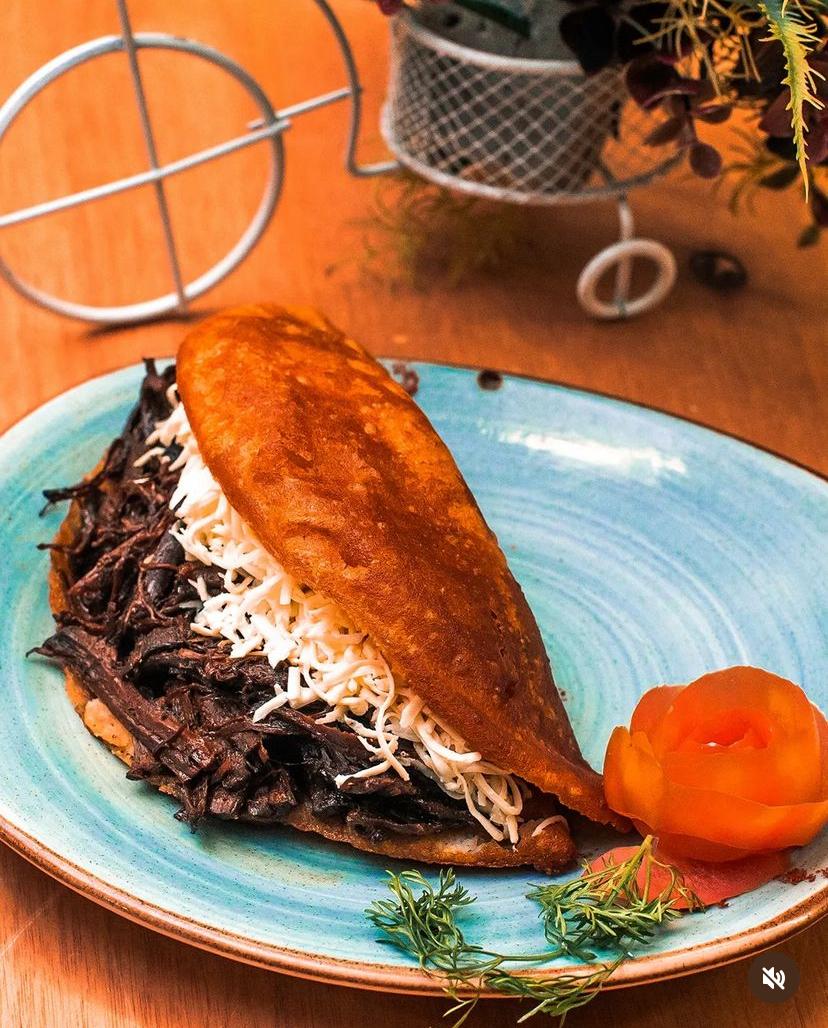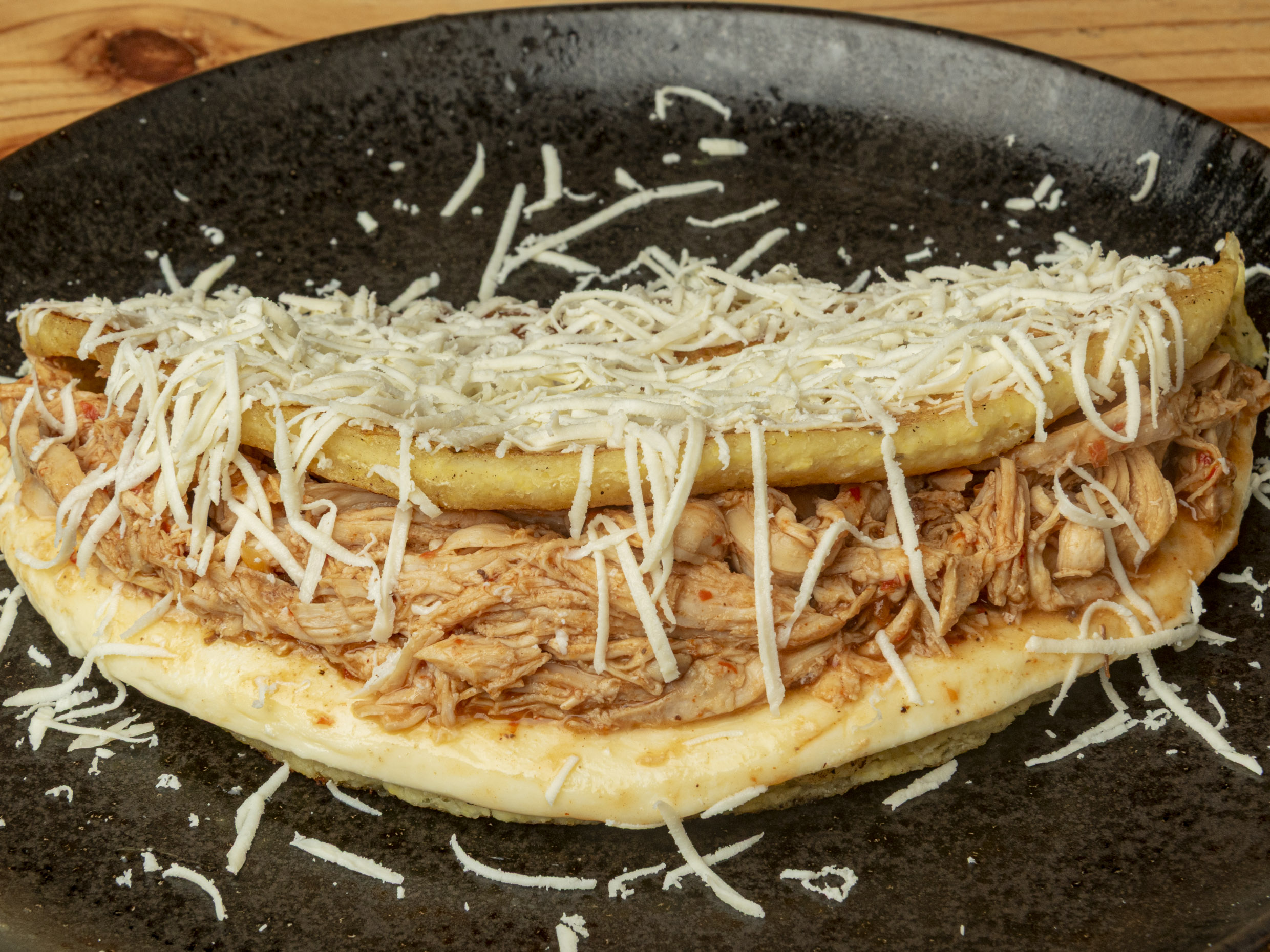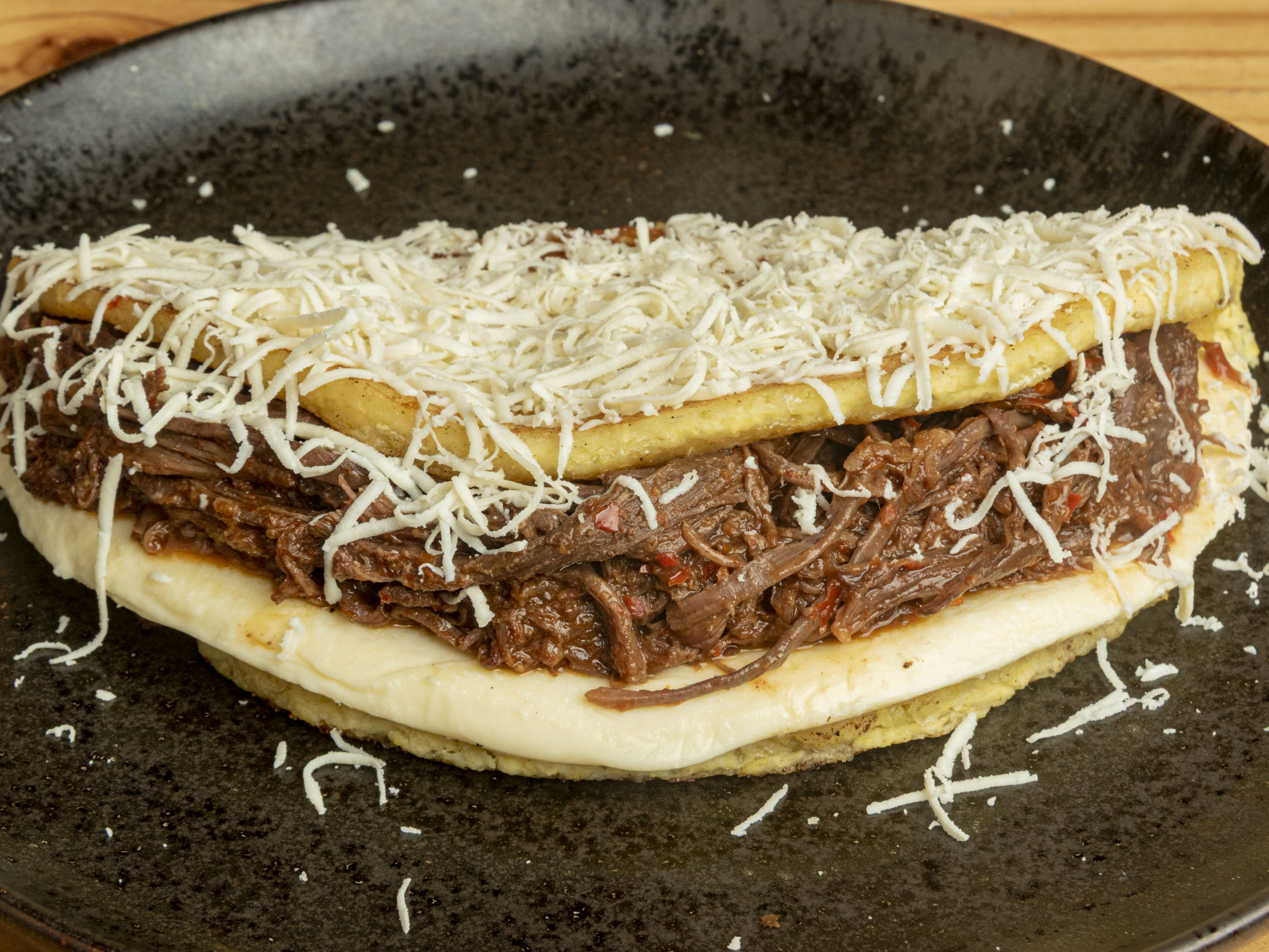 Arepa asada con carne desmechada, caraotas negras, tajadas de maduro y queso costeño.