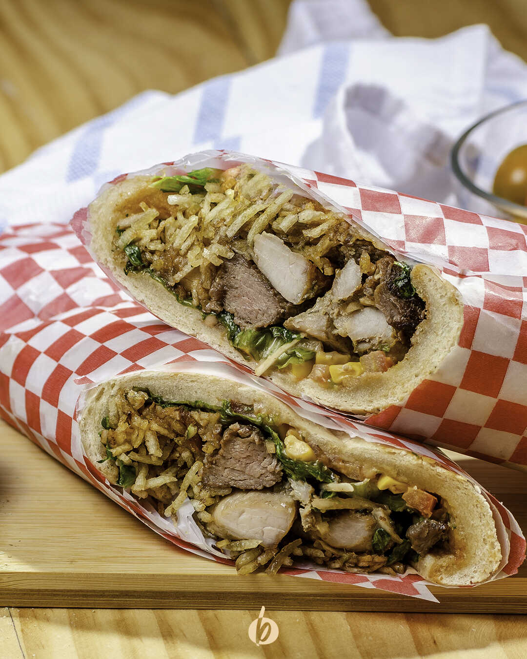 Pan baguette con lechuga, tomate, cebolla, papa cabello de ángel, salsas y 3 proteínas a la plancha (lomo fino de res, cerdo a la plancha y pollo a la plancha).