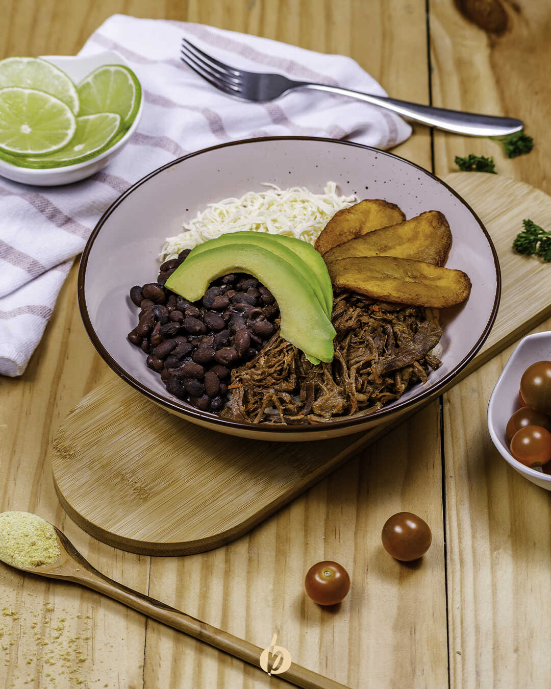 Bowl base de arroz acompañado de caraota, carne molida, pico de gallo, tajadas de maduro y arepitas