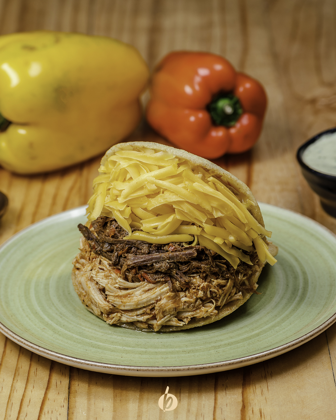 Arepa asada con carne desmechada, pollo desmechado y queso amarillo