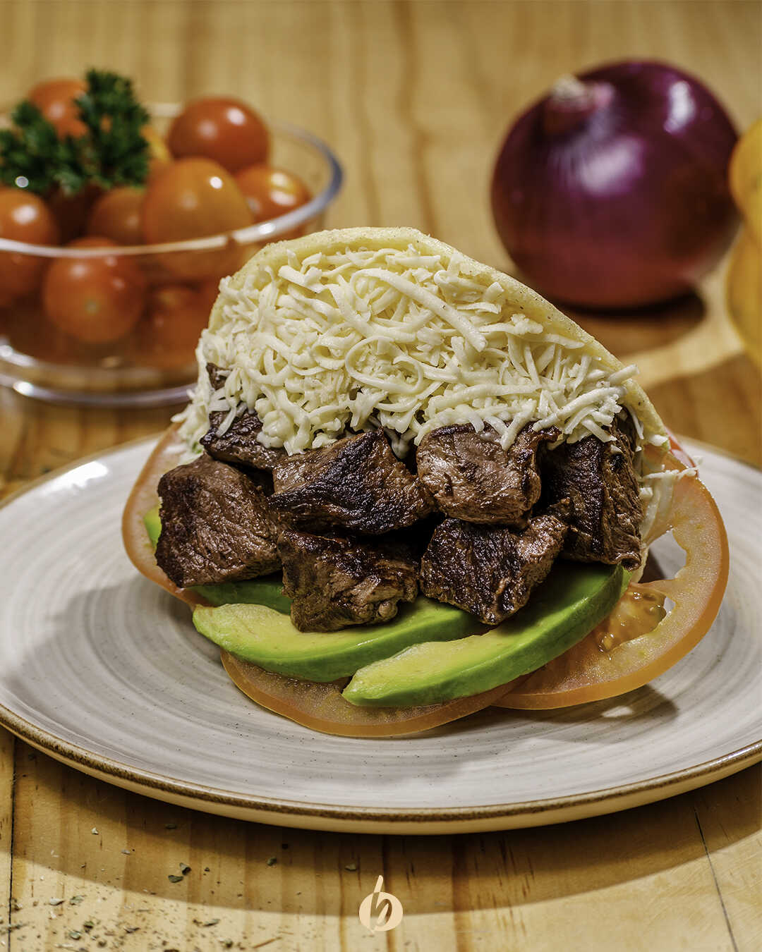 Arepa asada con lomo fino de res a la parrilla, aguacate, tajadas de tomate y queso costeño.