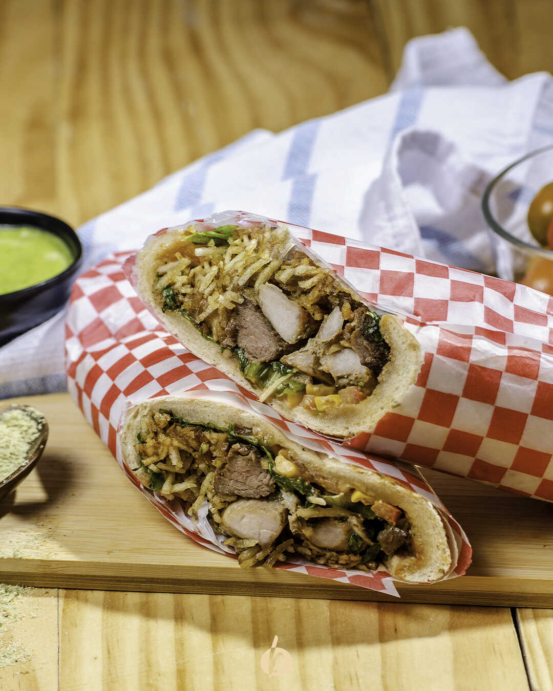 Pan baguette con lechuga, tomate, cebolla, papa cabello de ángel, salsas y dos proteínas a la plancha a elección (lomo fino de res, cerdo a la plancha o pollo a la plancha).