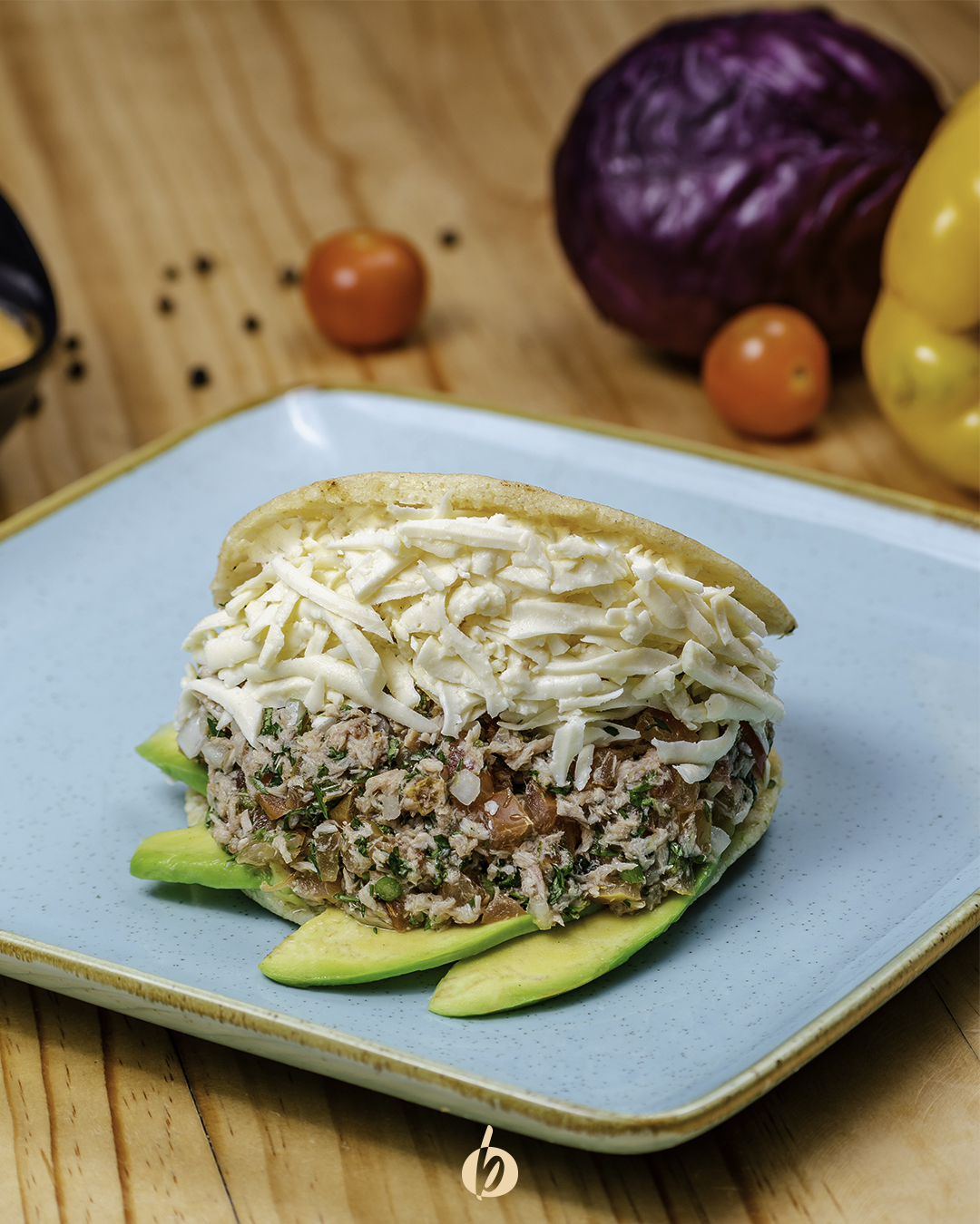 Arepa asada con una mezcla de atún fresco, tomate, cebolla, aceite de oliva y queso campesino.