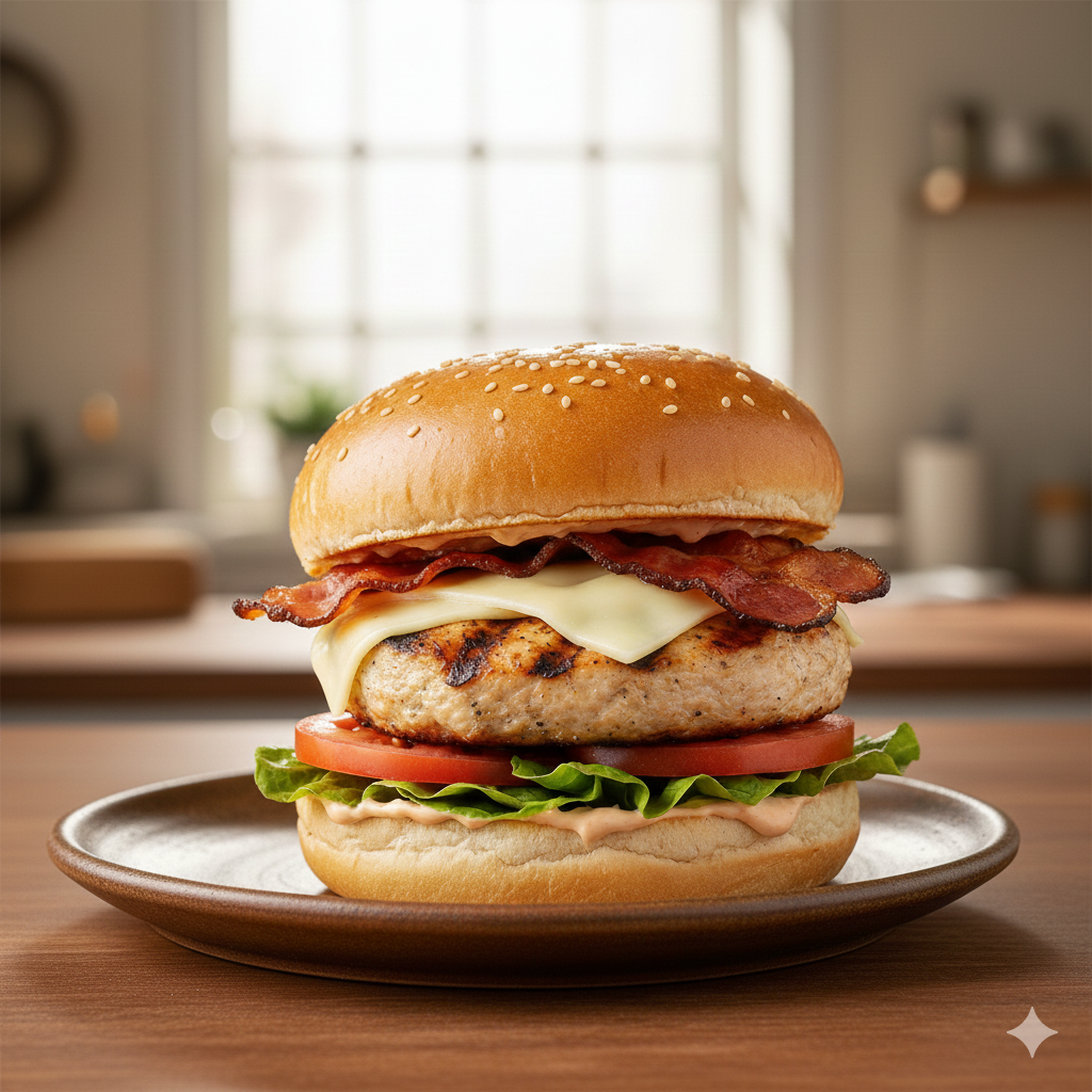 Burger de 120 g de pechuga a la plancha con queso doble crema, tocineta ahumada, vegetales frescos, pan de la casa y salsa de la casa.