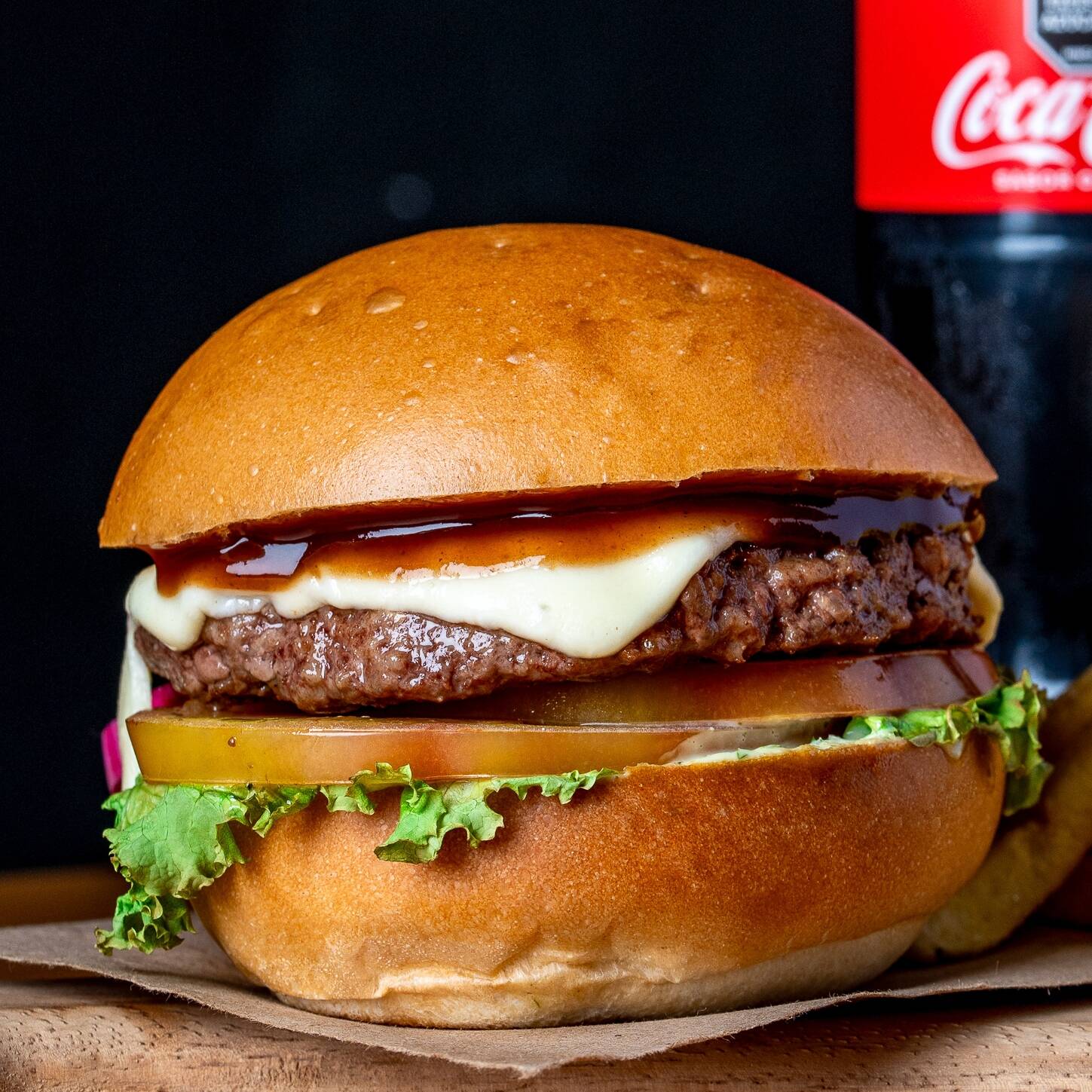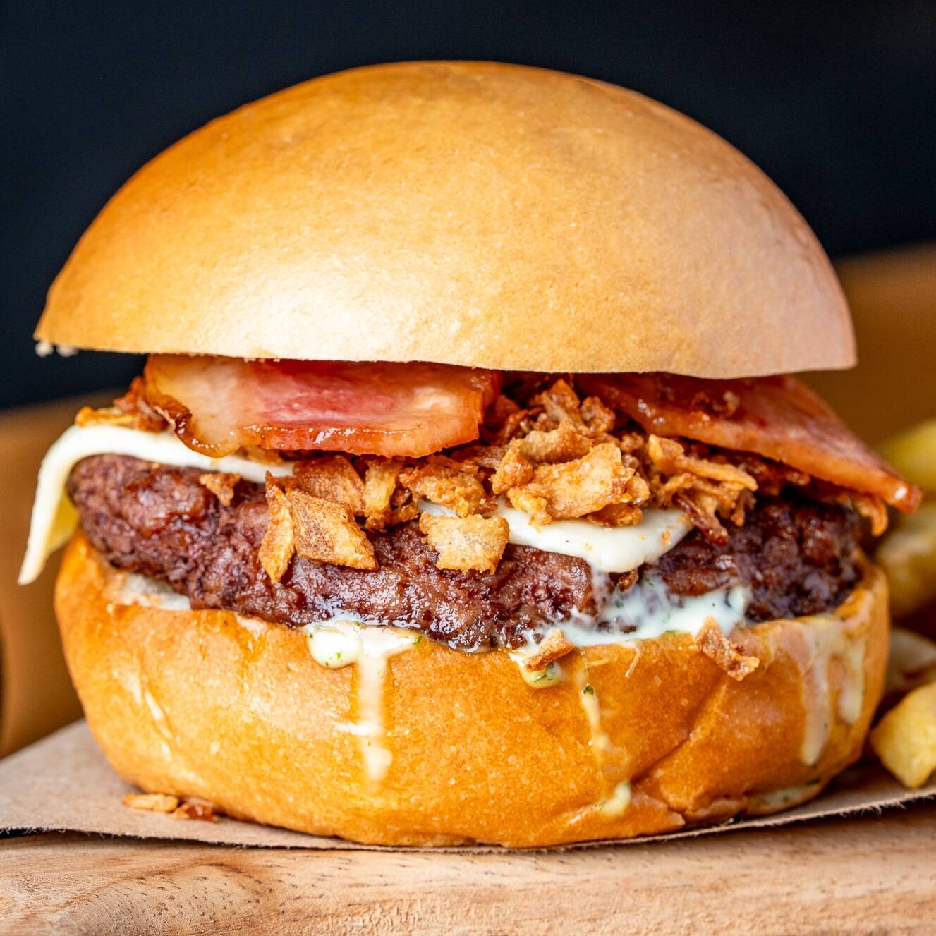 Burger de 120 g de res con queso doble crema, cebolla frita crocante, tocineta ahumada, pan de la casa y salsa de la casa.