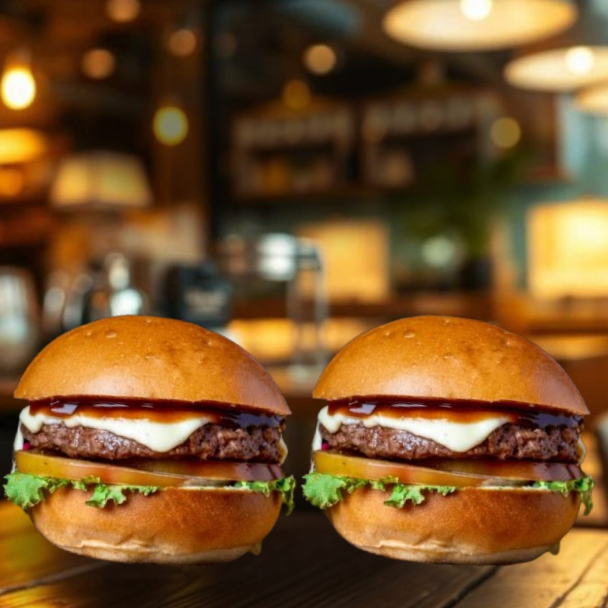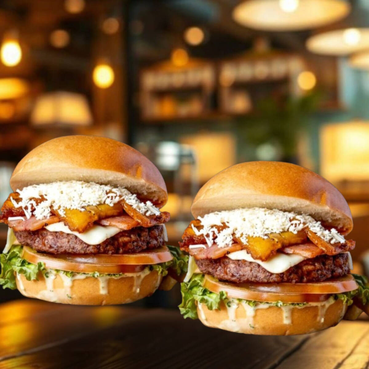 2 Burger de 120 g de res con queso doble crema, tocineta ahumada, maduro, guayabo y queso costeño, vegetales frescos, pan de la casa y salsa de la casa