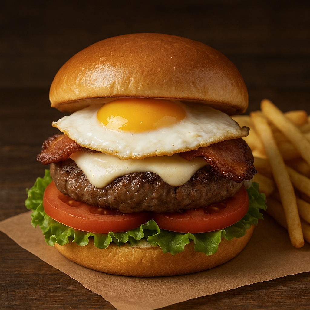 Burger de 120 g de res con queso doble crema, salchicha parrillera ahumada, huevo frito y vegetales frescos, pan de la casa y salsa de la casa.