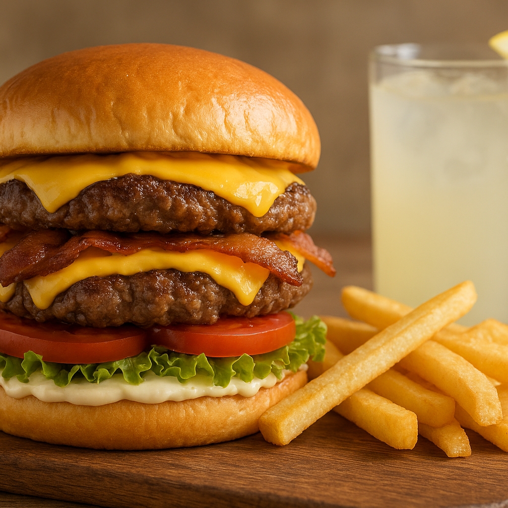 Burger de 120 g de res con queso doble crema, tocineta ahumada, vegetales frescos, pan de la casa, salsa de la casa, papas francesas y gaseosa 250 ml, elige tu favorita (Pepsi, manzana o Colombiana).