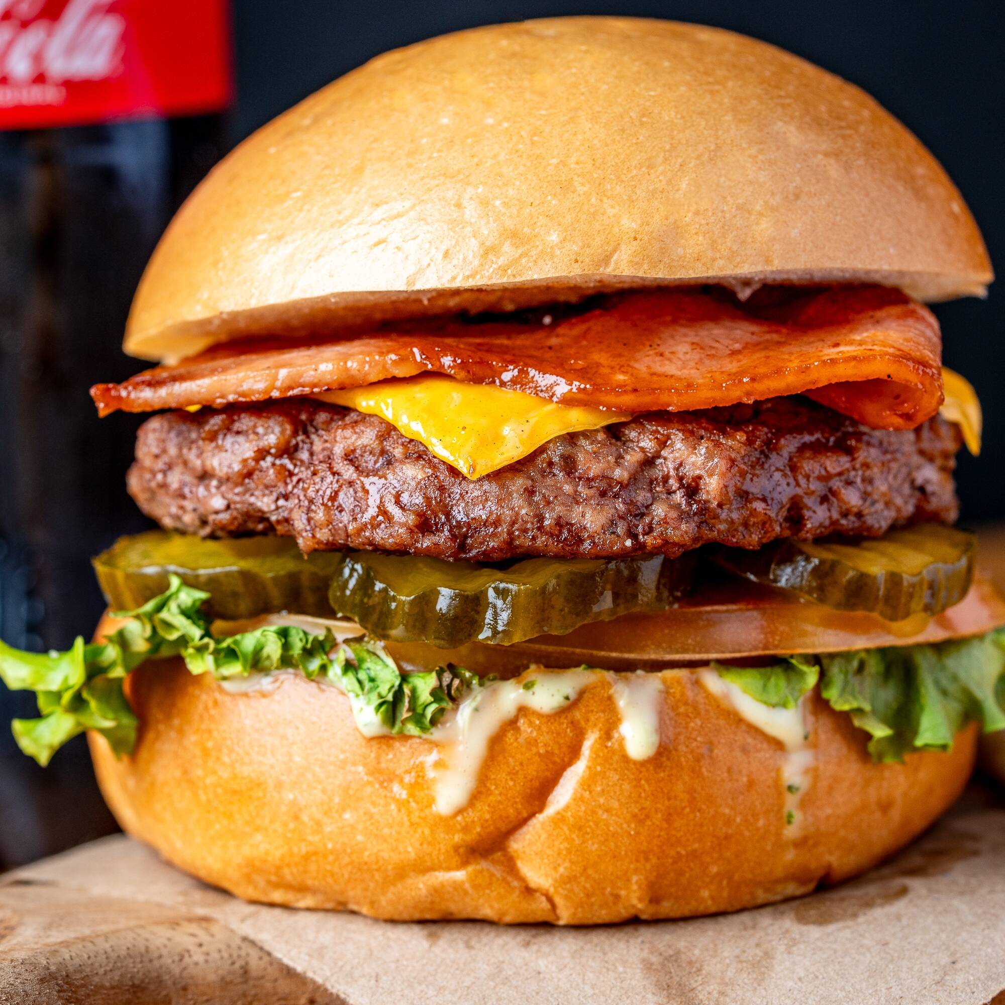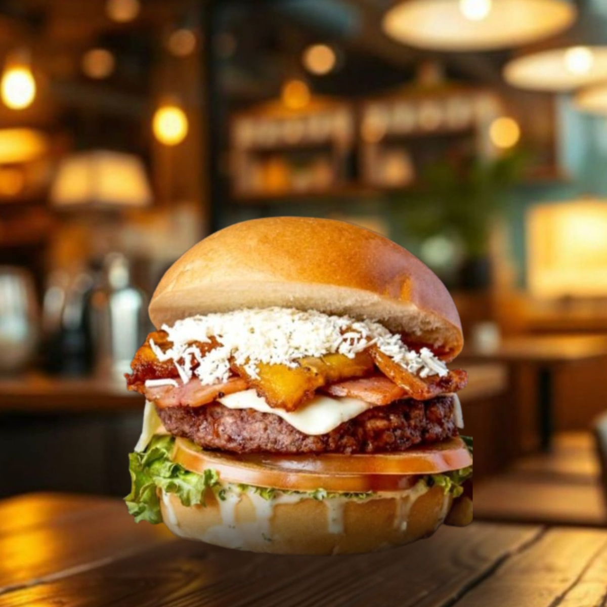 Burger de 120 g de res con queso doble crema, tocineta ahumada, pepinillos, vegetales frescos, pan de la casa y salsa de la casa.