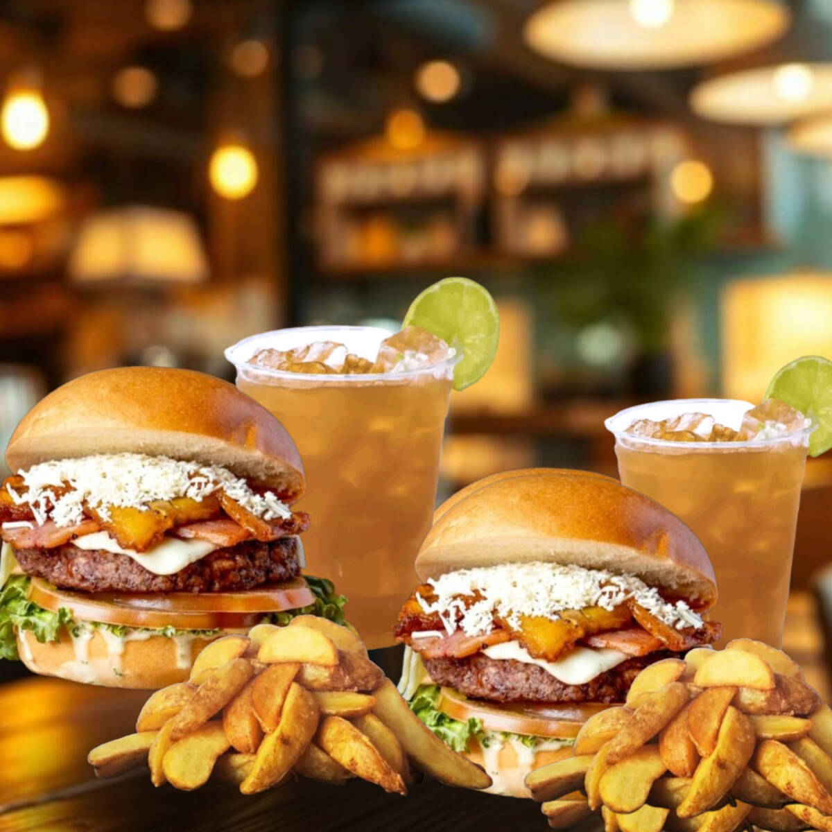 2 burguer maduritas de 120gr cada una + 2 papas en cascos + 2 limonada de panela