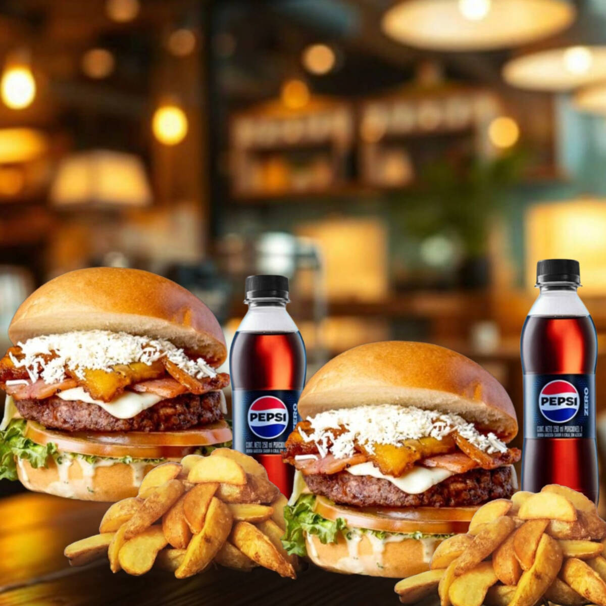 2 hamburguesas con carne de res 120gr tocineta maduritos fritos vegetales frescos + 2 papas en cascos+ 2 gaseosa 250 ml