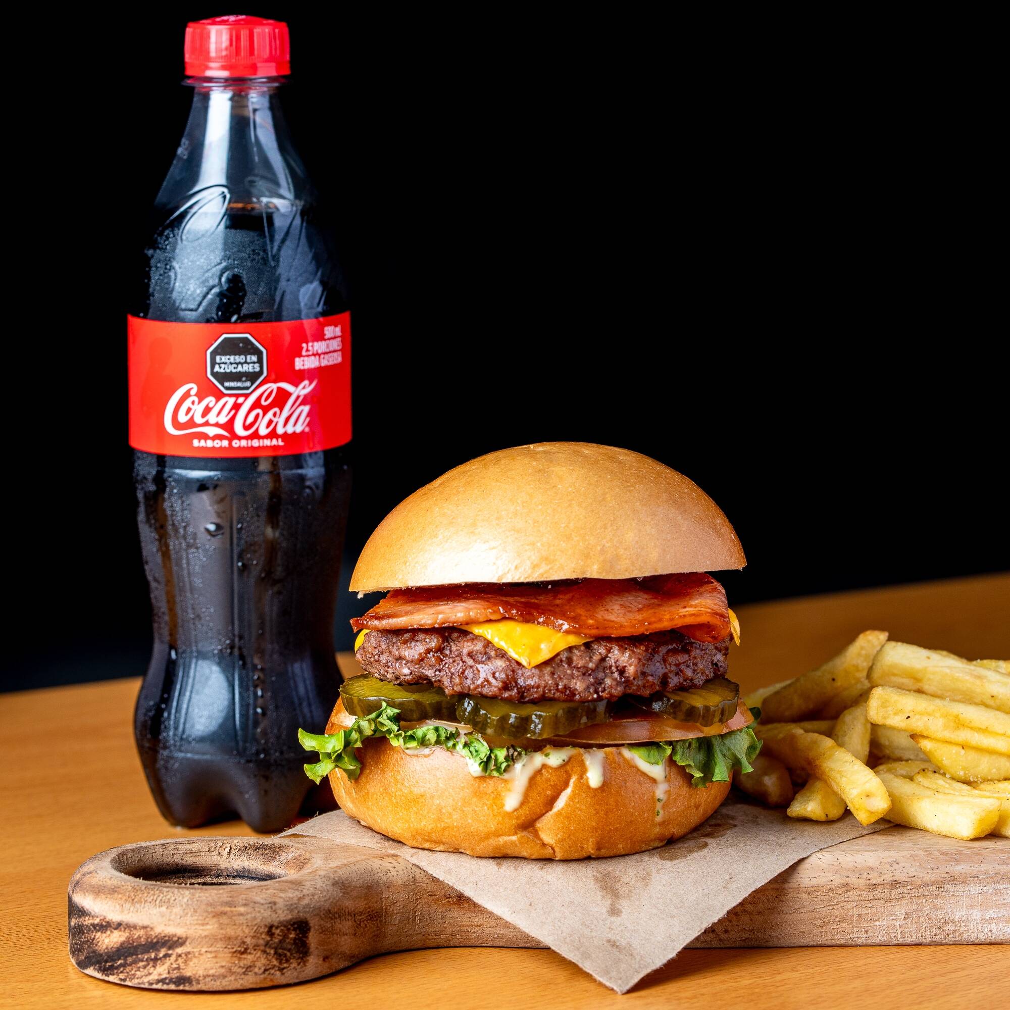 Burger de 120 g de res con queso doble crema, tocineta ahumada, pepinillos, vegetales frescos, pan de la casa, salsa de la casa, papas fritas y gaseosa 250 ml, elige tu favorita (Pepsi, manzana o Colombiana).