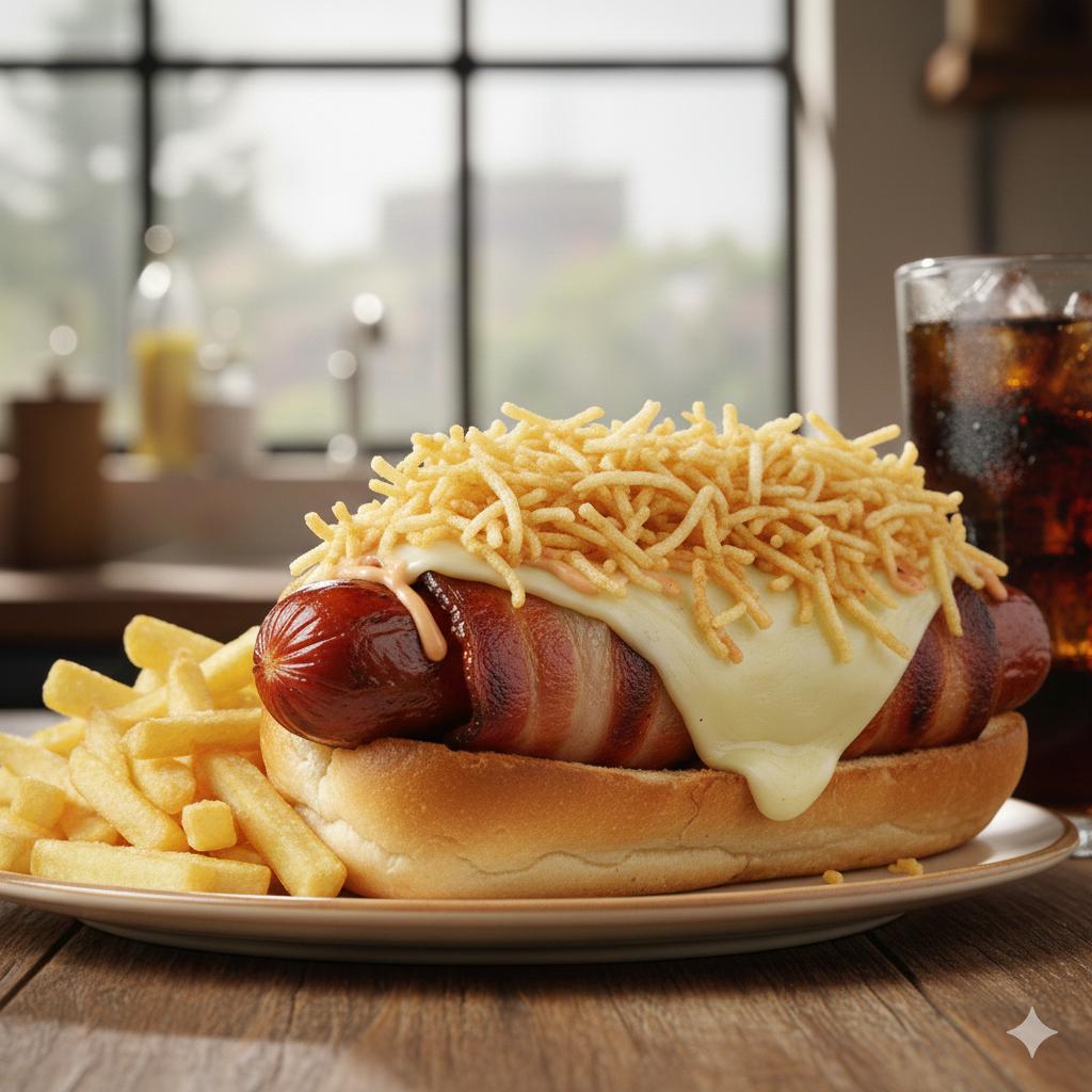 Salchicha americana Zenú, tocineta ahumada, queso doble crema, papa cabello de ángel, salsas de la casa, pan.
