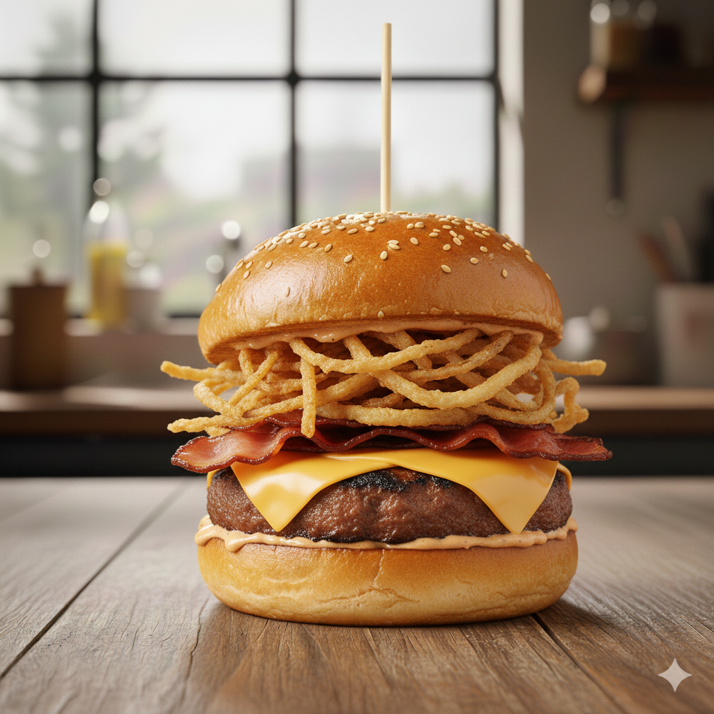 Carne de res artesanal de 100 g cebolla crispy queso doble crema tocineta ahumada, pan brioche, salsa de la casa,