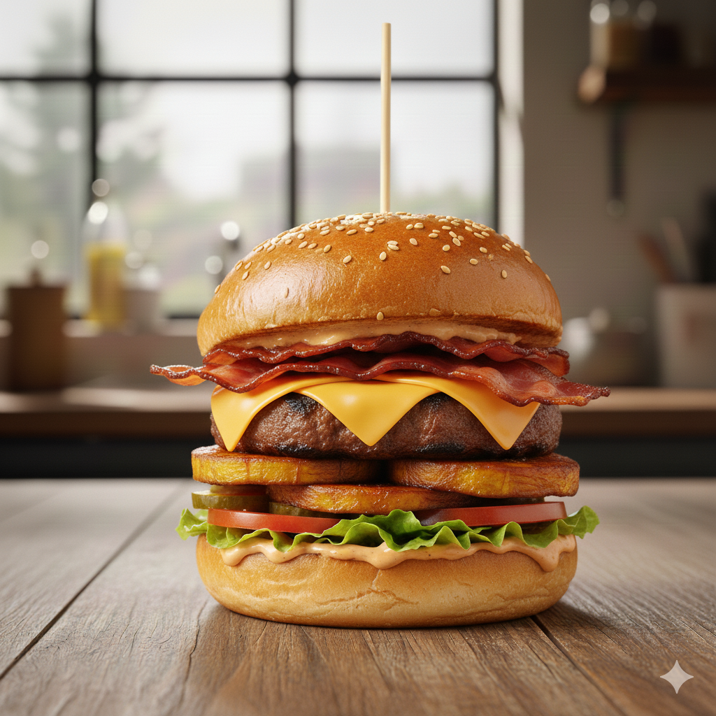 Carne de res artesanal de 100 g, maduro, guayabo frito, queso doble crema, tocineta ahumada, lechuga, tomate, pan brioche, salsa de la casa.