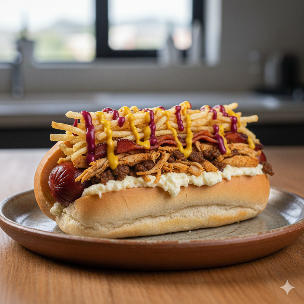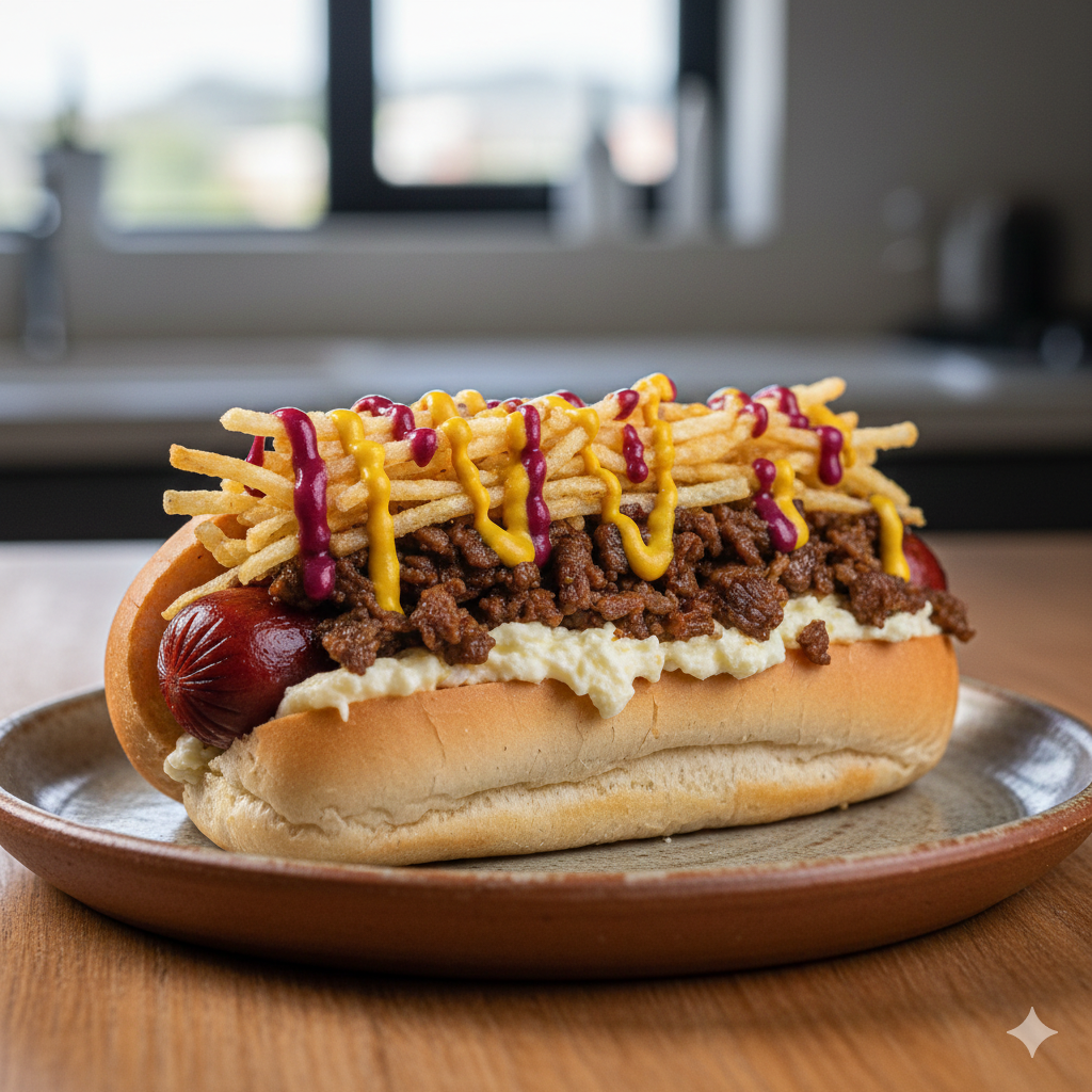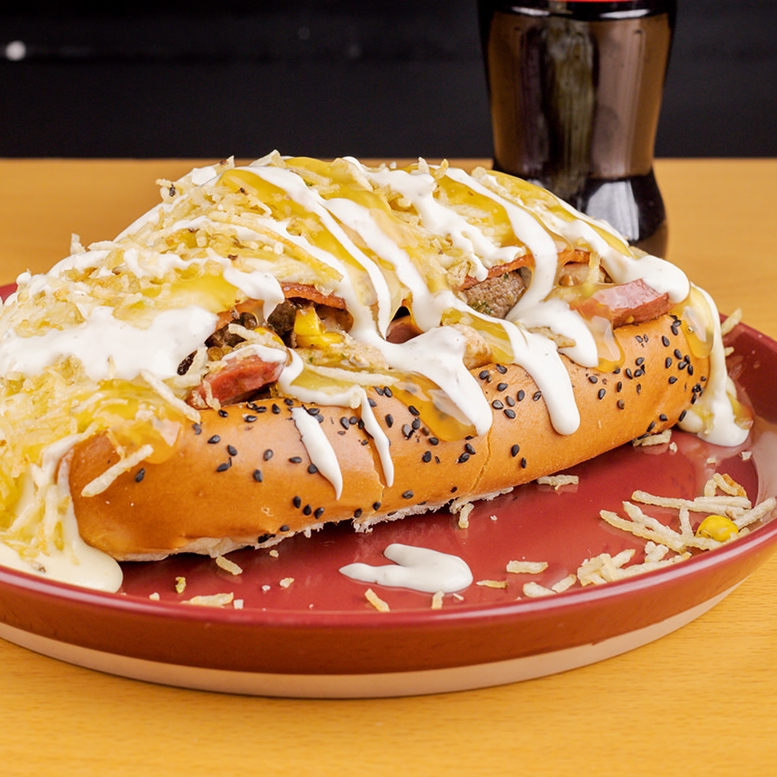 Salchicha americana Zenú, carne salteada, queso doble crema, papa cabello de ángel, salsas de la casa, pan.