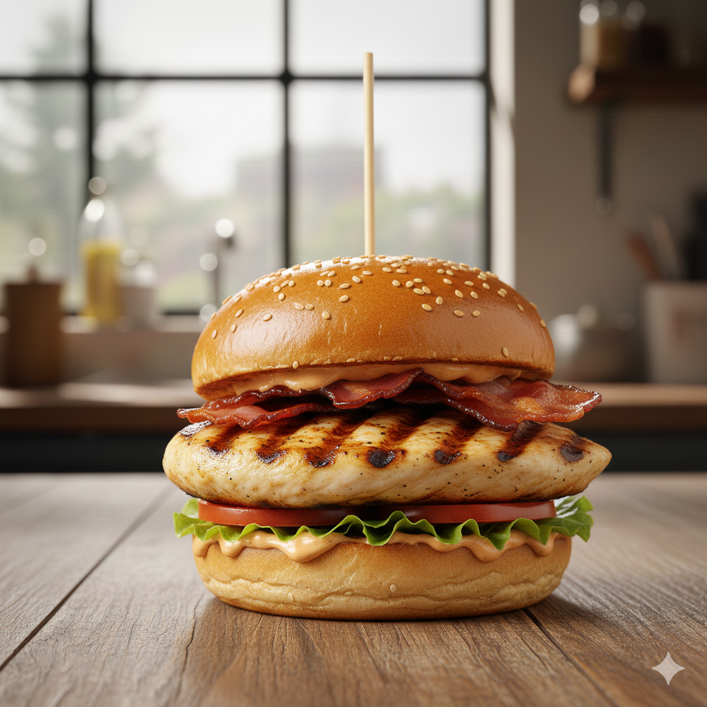 153 g De pechuga a la plancha, queso doble crema, tocineta ahumada, lechuga, tomate, pan brioche, salsa de la casa.