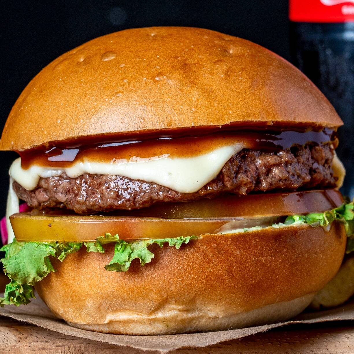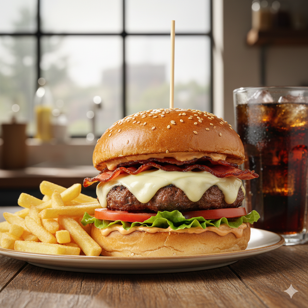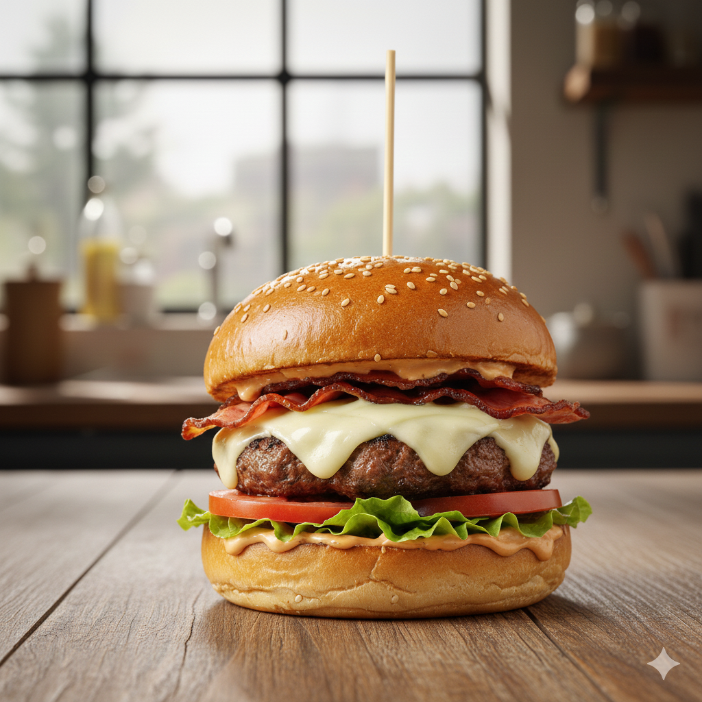 Carne de res artesanal de 100 g, queso doble crema, tocineta ahumada, lechuga, tomate, pan brioche, salsa de la casa.