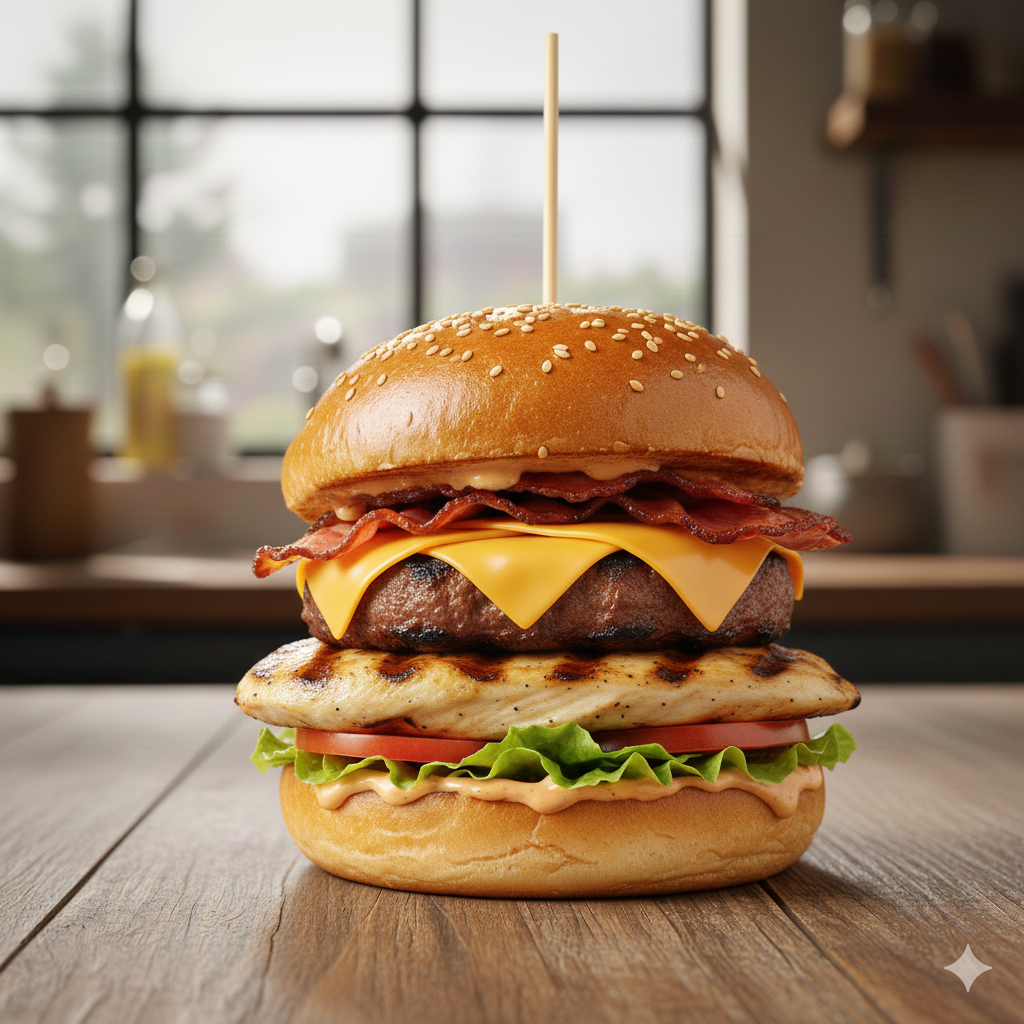 Carne de res artesanal de 100 g, pechuga a la plancha, queso cheddar, tocineta ahumada, lechuga, tomate pan brioche, salsa de la casa.