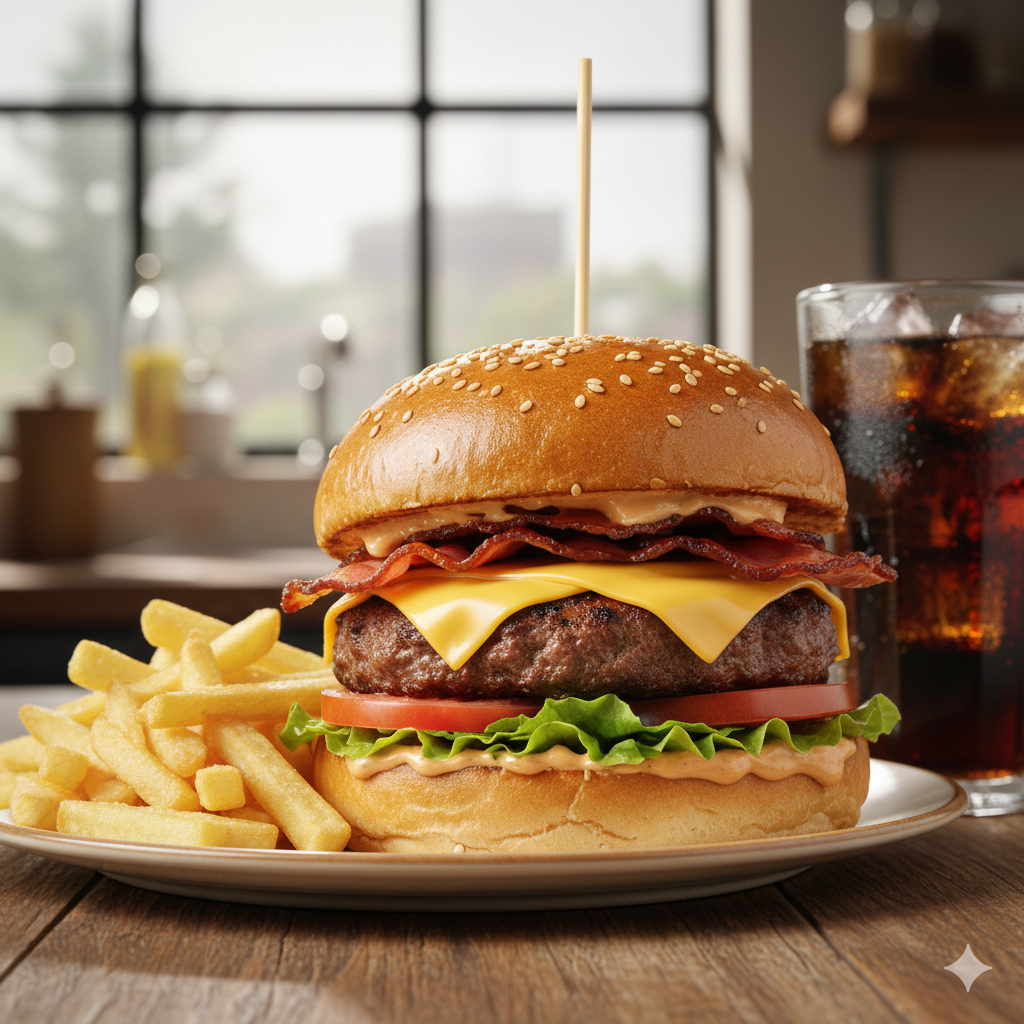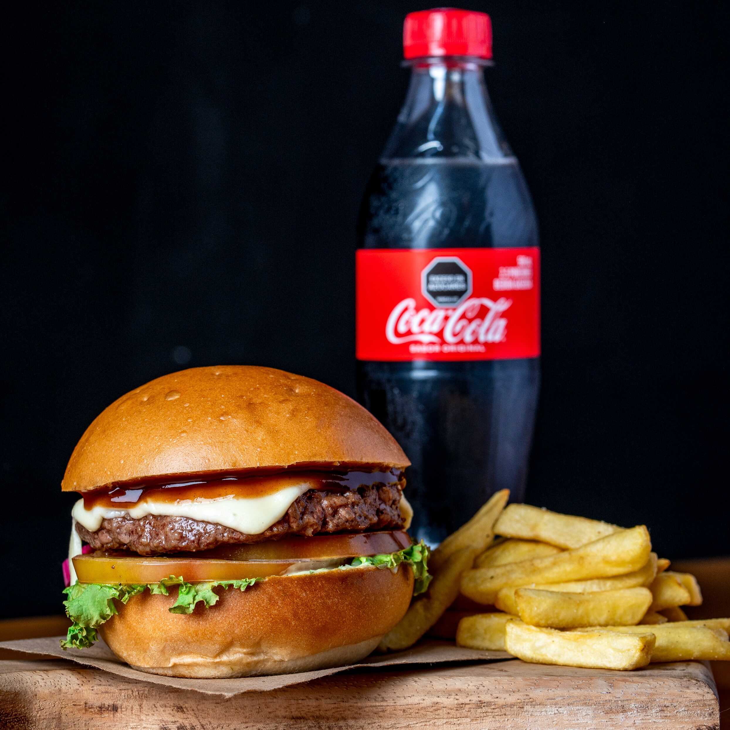 Carne de res artesanal de 100 g, queso cheddar, tocineta ahumada, pepinillos, lechuga, tomate, pan brioche, salsa de la casa, papas francesas y gaseosa 250 ml.