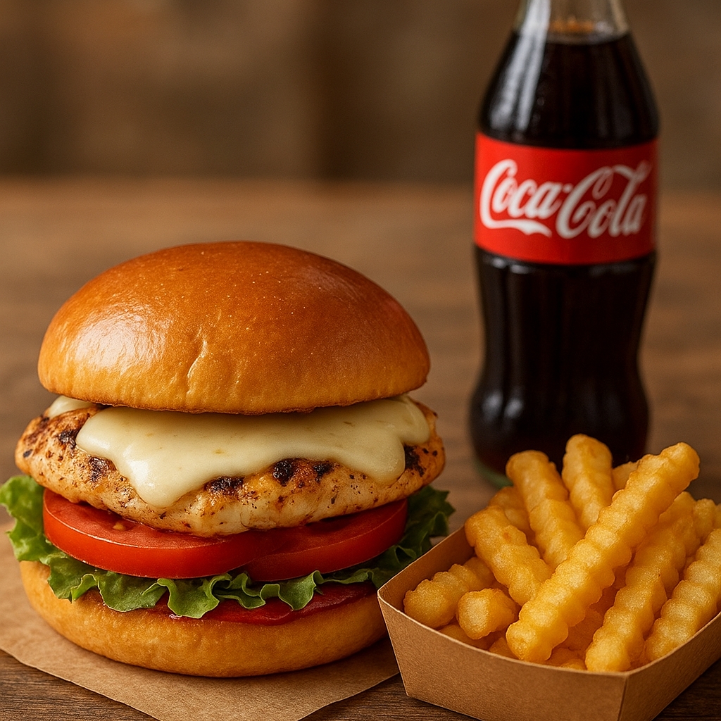 153 g De pechuga a la plancha, queso doble crema, tocineta ahumada, lechuga, tomate, pan brioche, salsa de la casa, papas francesas y gaseosas 250 ml.