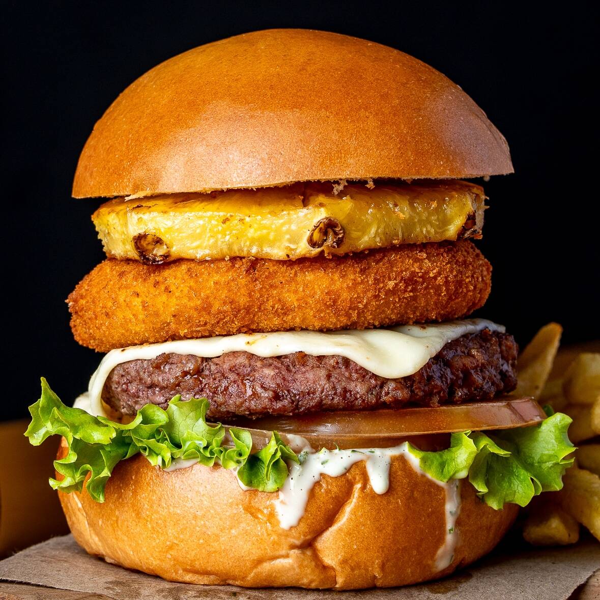 Carne de res artesanal de 100 g, queso costeño asado, piña asada, salchicha, tocineta ahumada, lechuga, tomate, pan brioche, salsa de la casa.