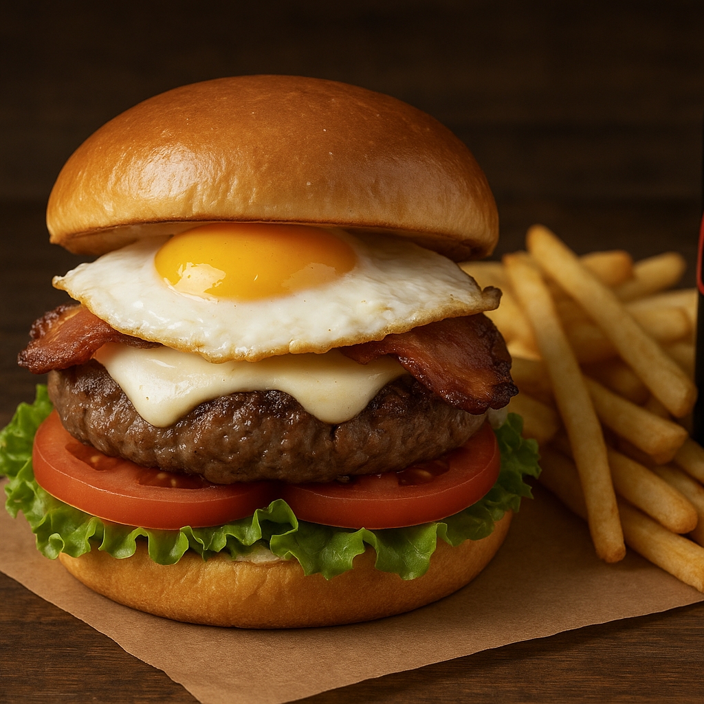Carne de res artesanal de 100 g, huevo frito, salchicha, queso doble crema, tocineta ahumada, lechuga, tomate, pan brioche, salsa de la casa.