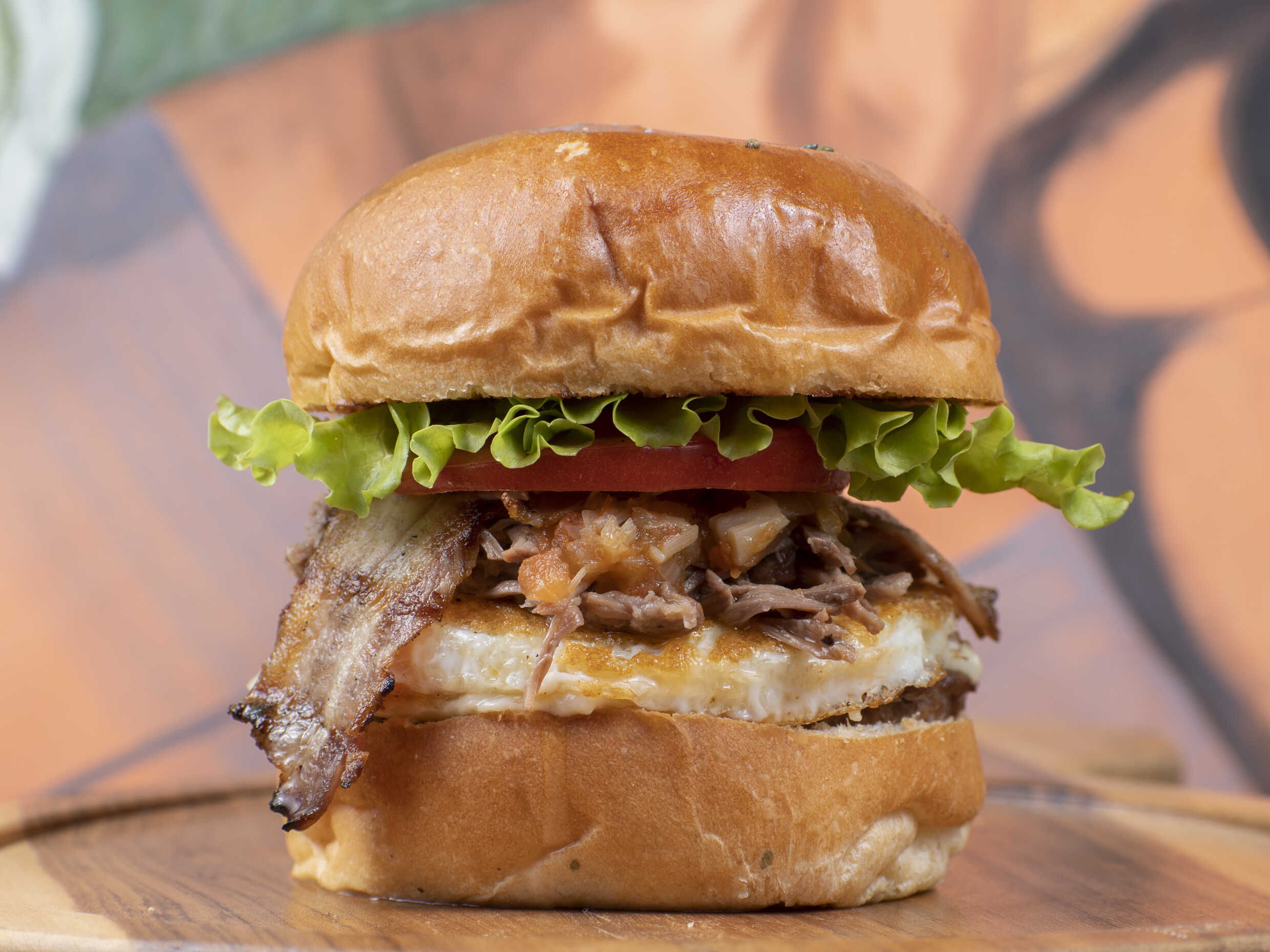 Pan artesanal tipo brioche bañado en ajonjoli negro, queso mozzarella, huevo frito, cebolla saldeada en BBQ, tocineta, todo esto bañado en nuestra deliciosa salsa de la casa, tomate, y lechuga fresca.