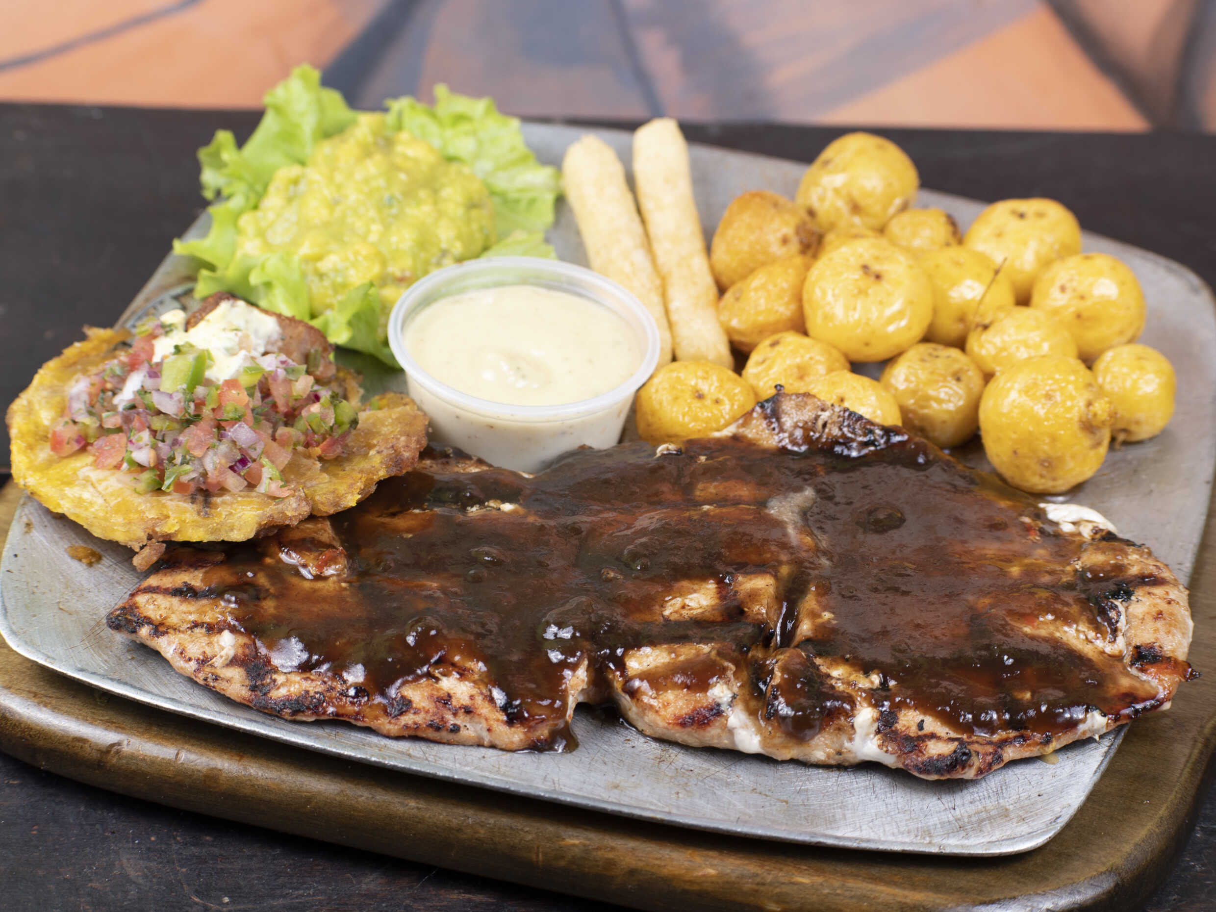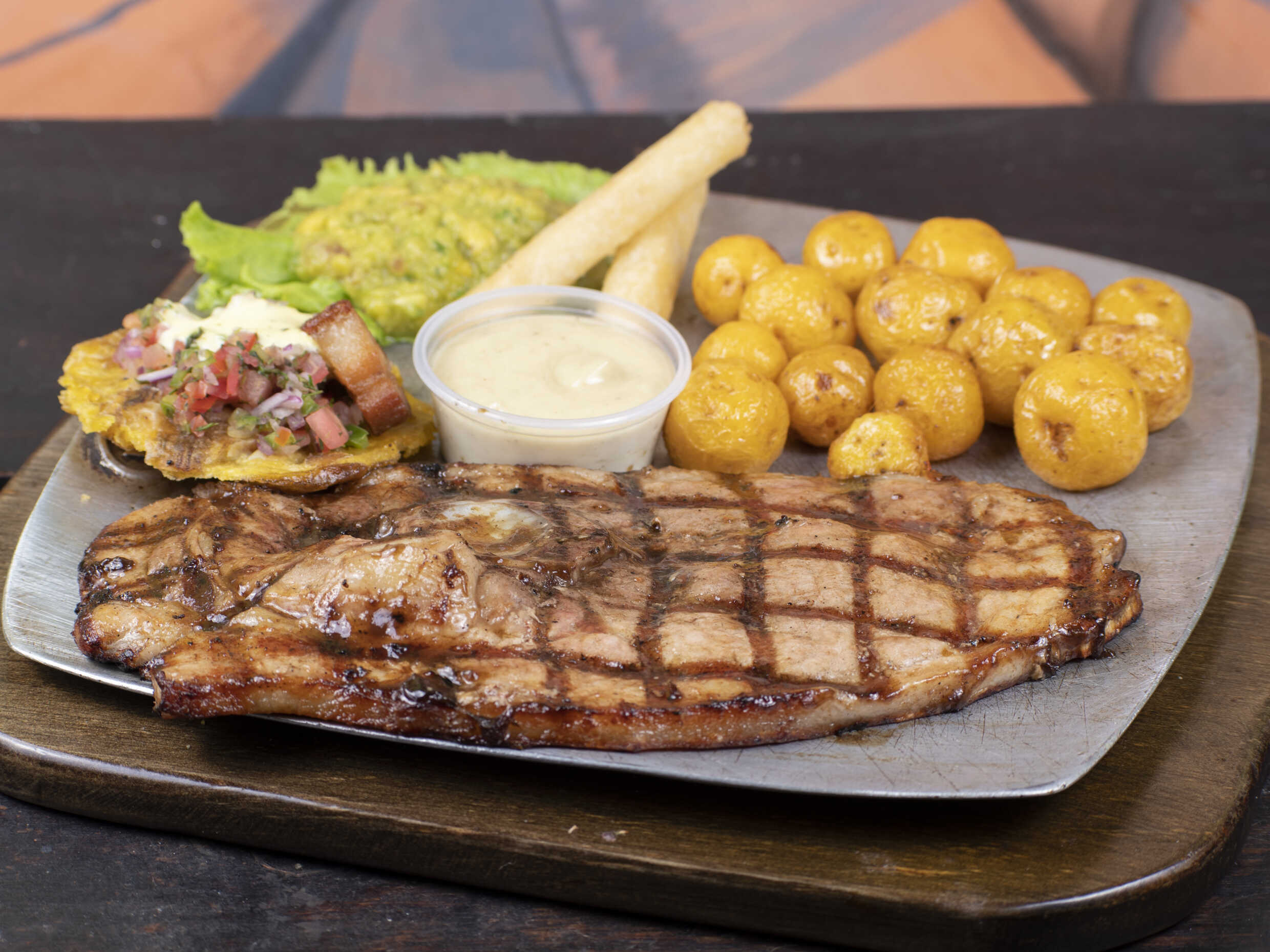 200 g de pechuga y carne más morcilla, choricito, costillita de cerdo, acompañado de papitas francesas, queso gratinado, guacamole, salsas de la casa y nuestra deliciosa entrada de pico de gallo, patacón crocante, chicharrón y suero costeño.