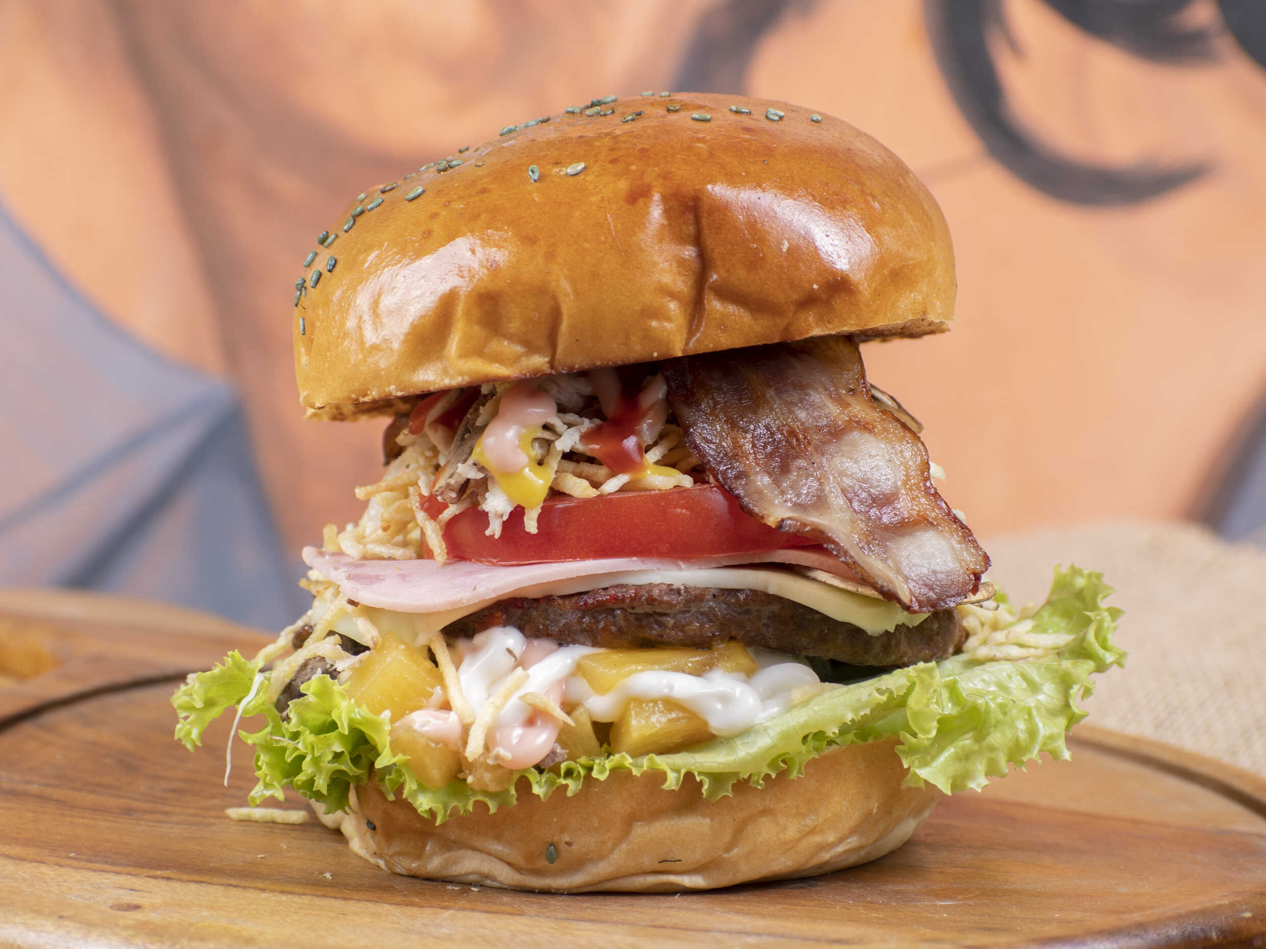 Pan artesanal tipo brioche bañado en ajonjoli negro, queso asado, chicharron crocante, chips de patacon, bañada en un delicioso suero consteño, salsa de la casa, tomate y lechuga fresca.