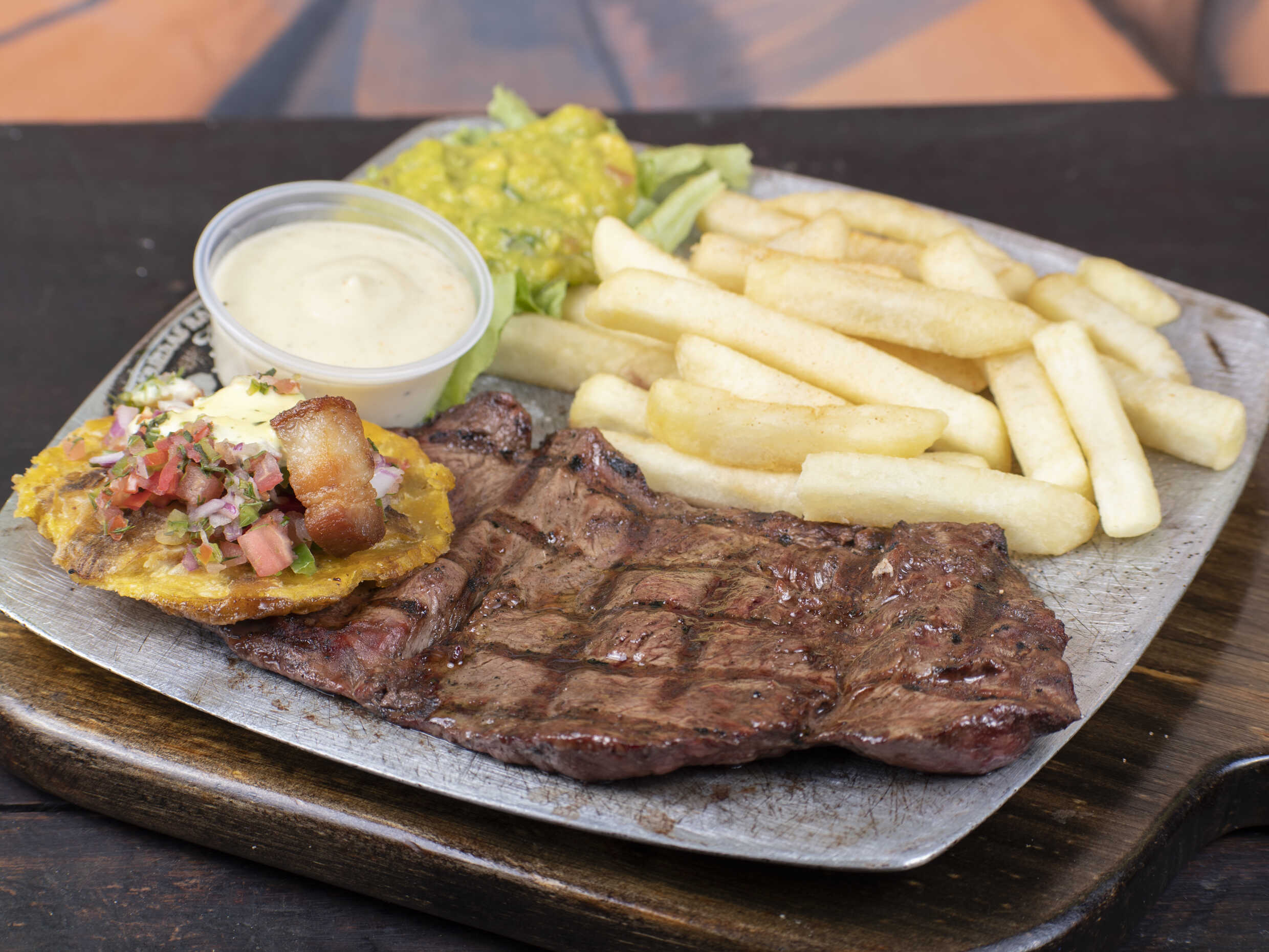 200 g de carne acompañado de papitas francesas, queso gratinado, guacamole, salsas de la casa y nuestra deliciosa entrada de pico de gallo, patacón crocante, chicharrón y suero costeño.