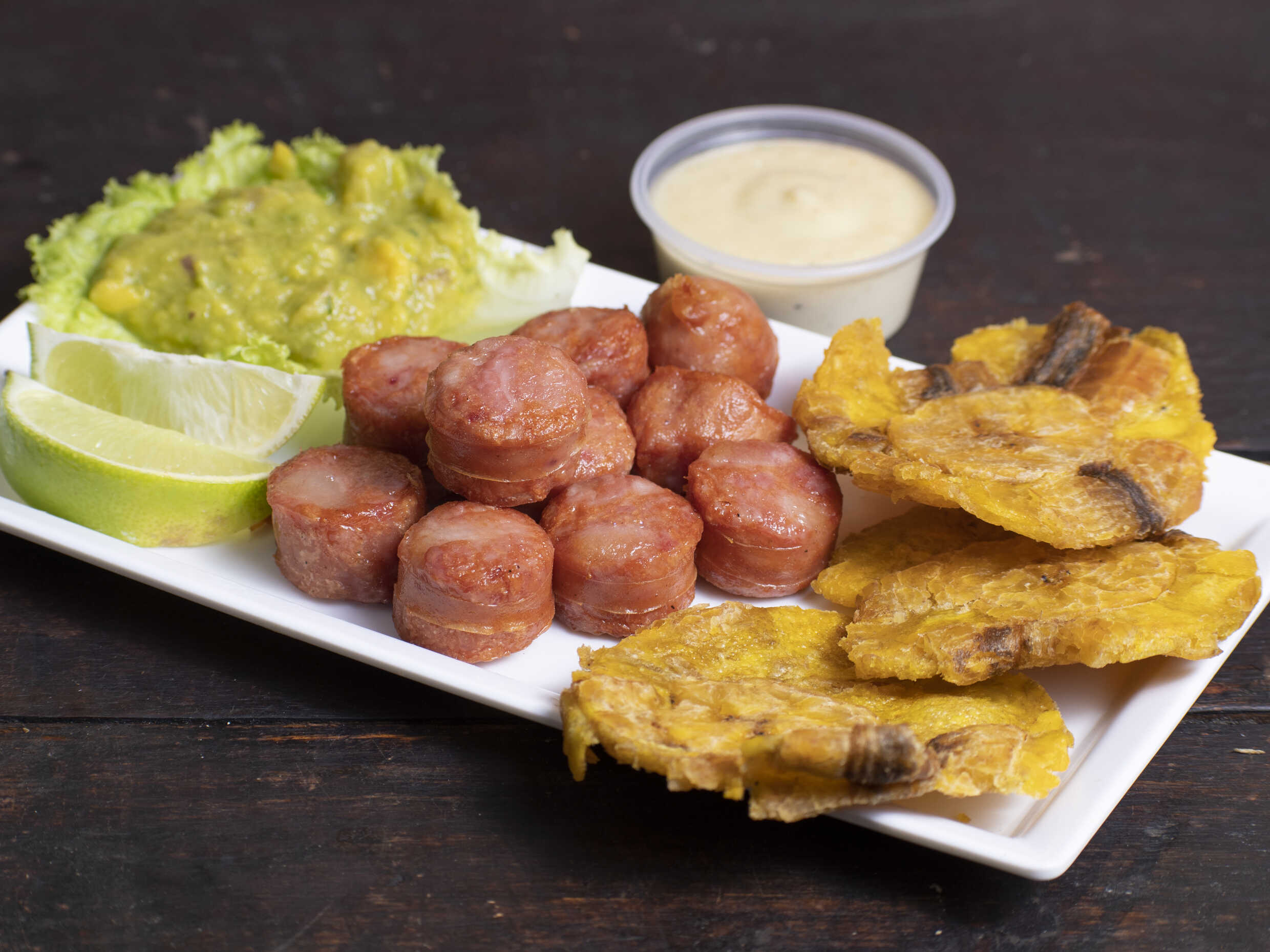 Un delicioso choricito acompañado de dos pataconcitos crocantes, guacamole y limón.