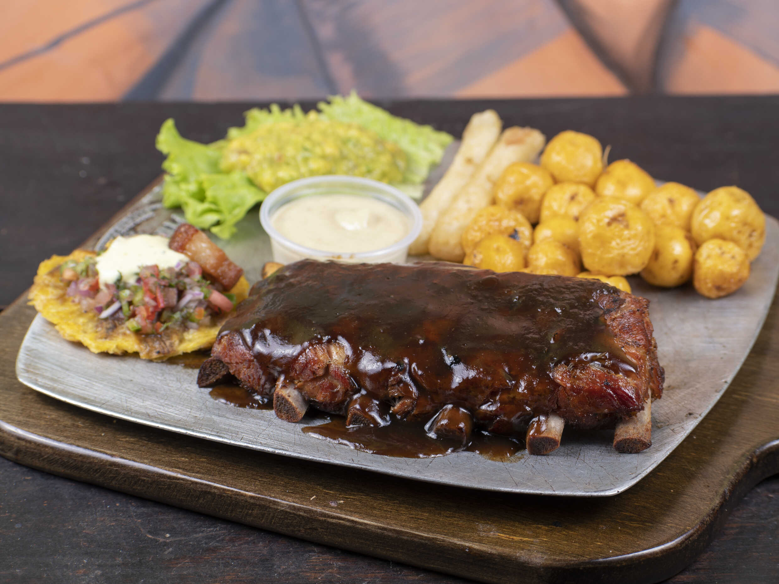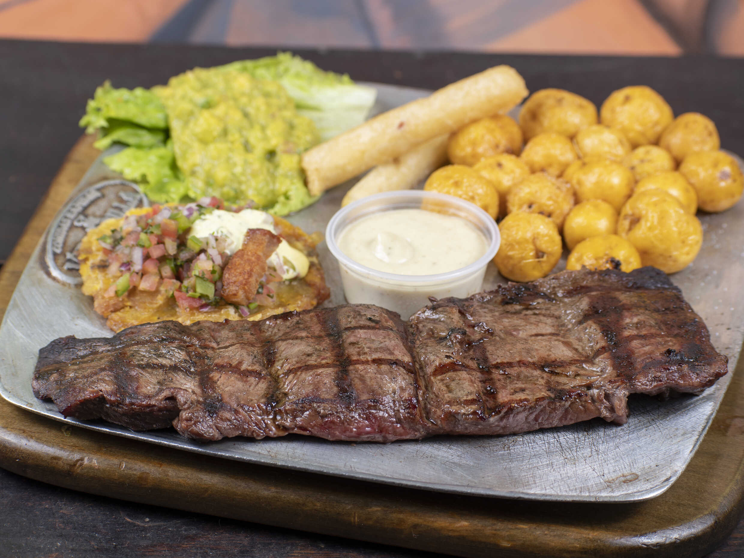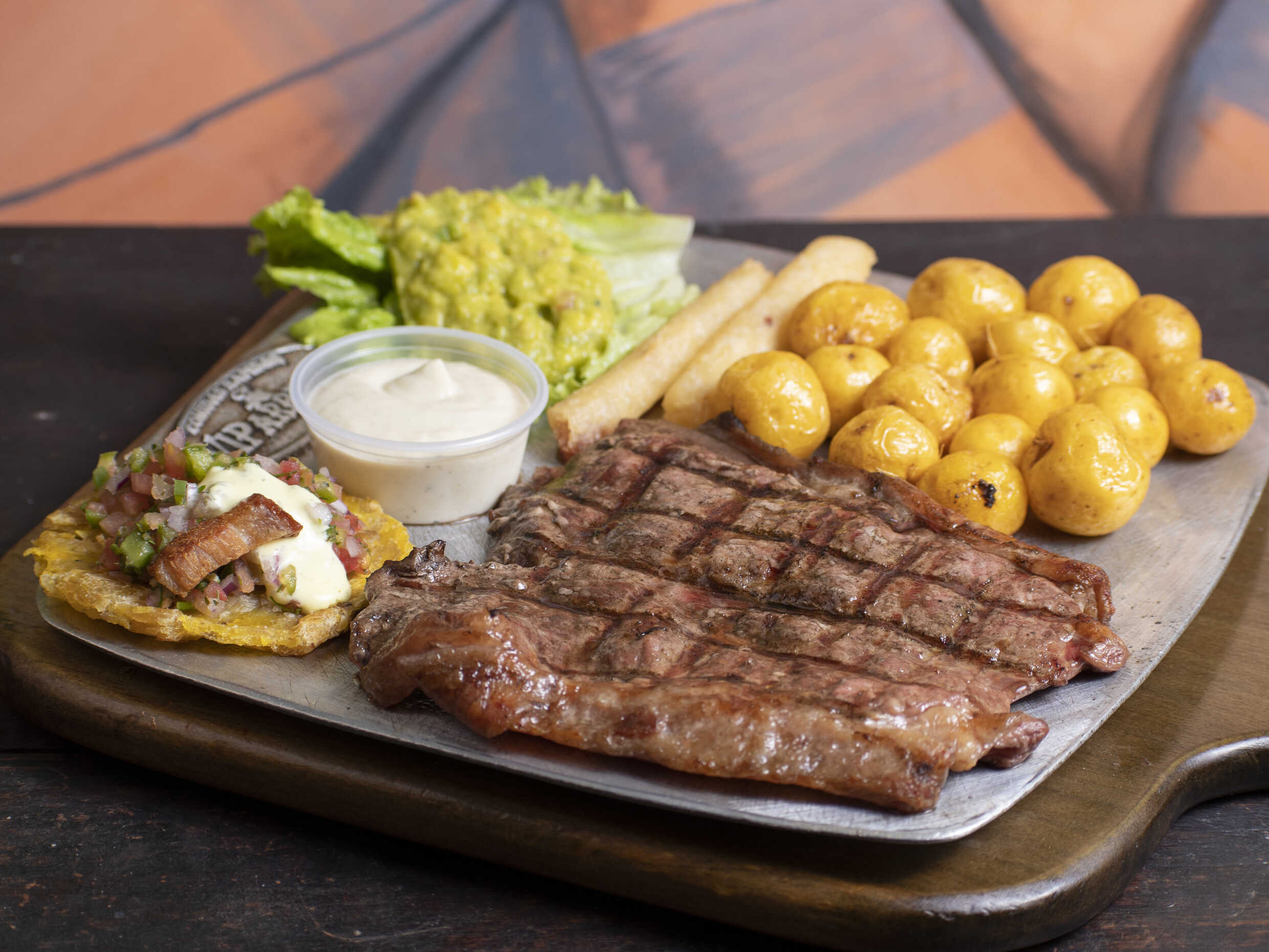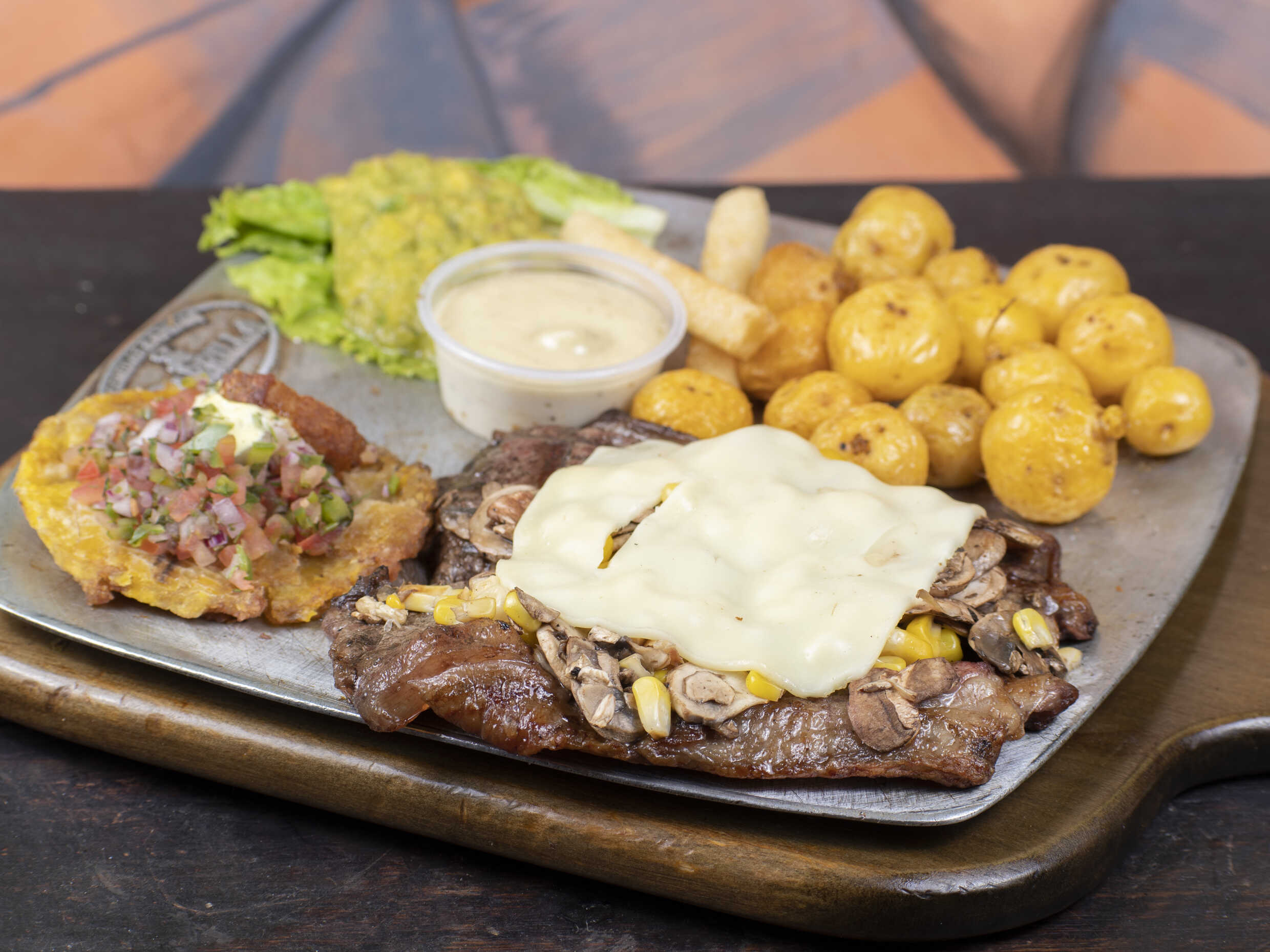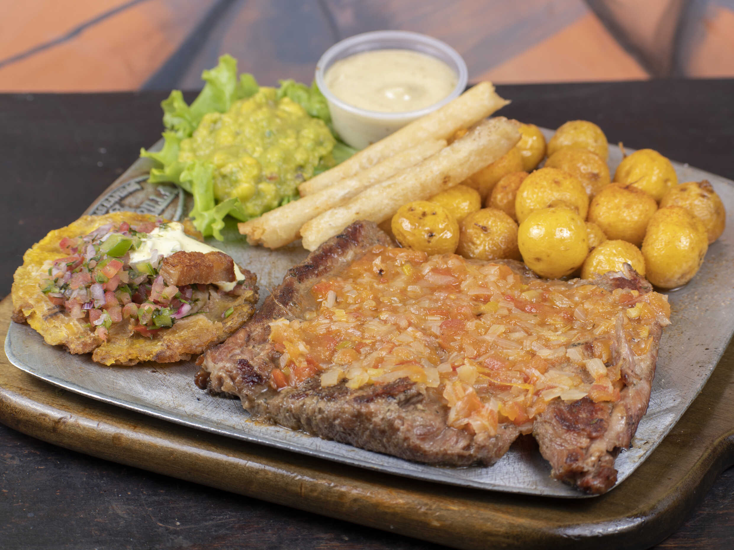 Acompañado de papitas a elección, yuquita en astilla, quesito gratinado en mazorca y champiñón sobre churrasco, guacamole, salsas de la casa y nuestra deliciosa entrada de pico de gallo, patacón crocante, chicharrón y suero costeño 300 g.