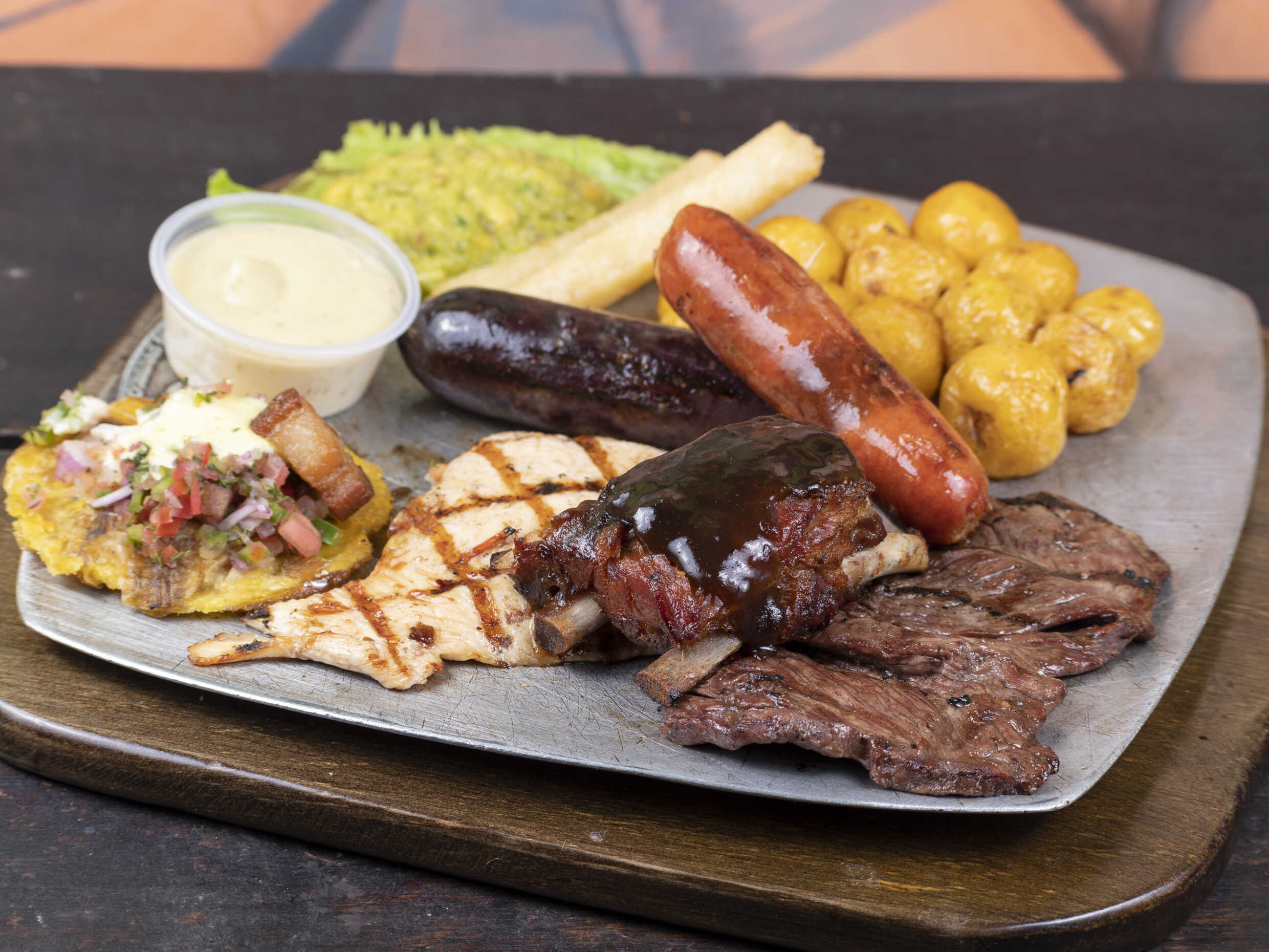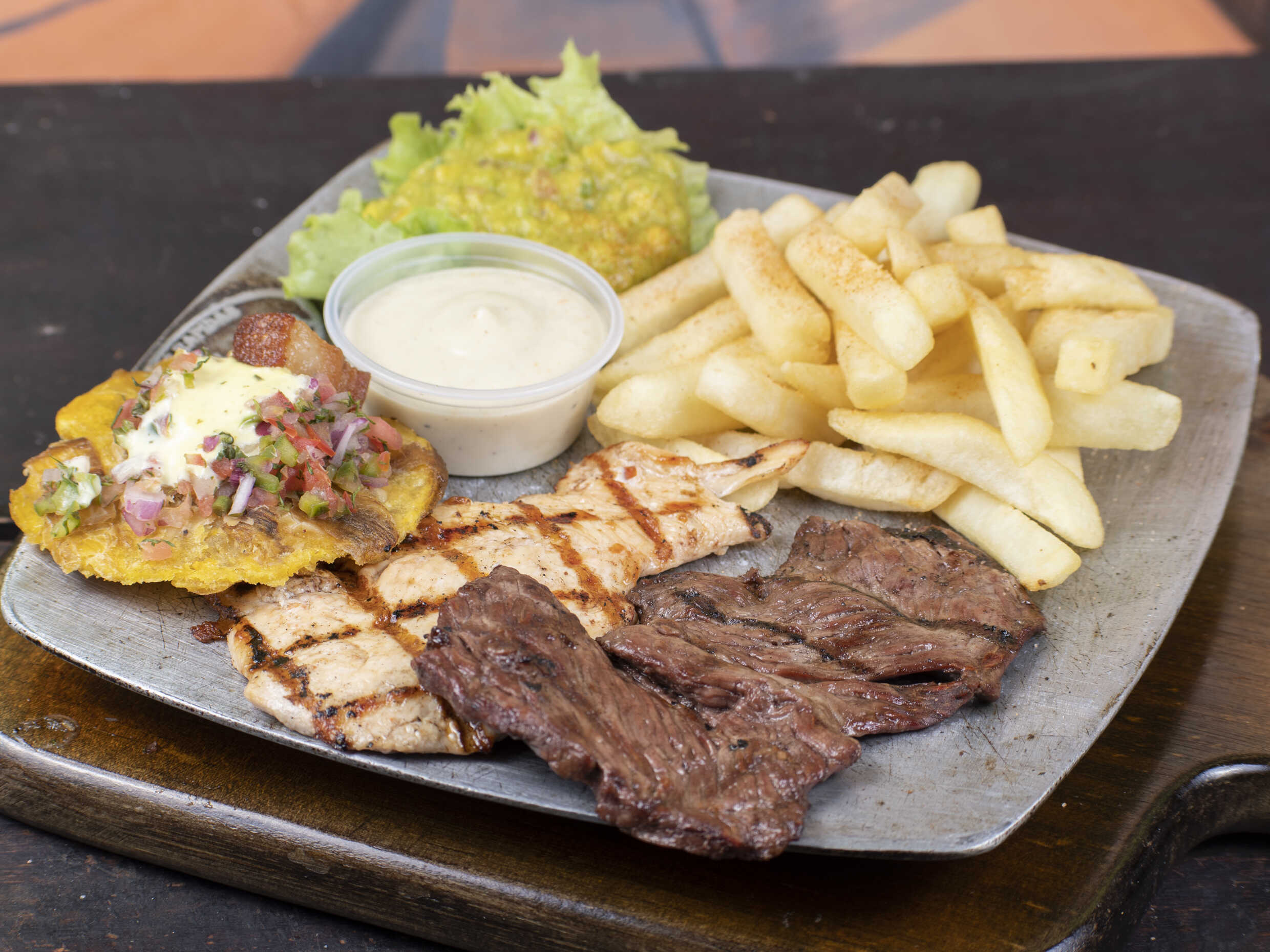 200 g de pechuga y carne más morcilla, choricito, costillita de cerdo, acompañado de papitas francesas, queso gratinado, guacamole, salsas de la casa y nuestra deliciosa entrada de pico de gallo, patacón crocante, chicharrón y suero costeño.