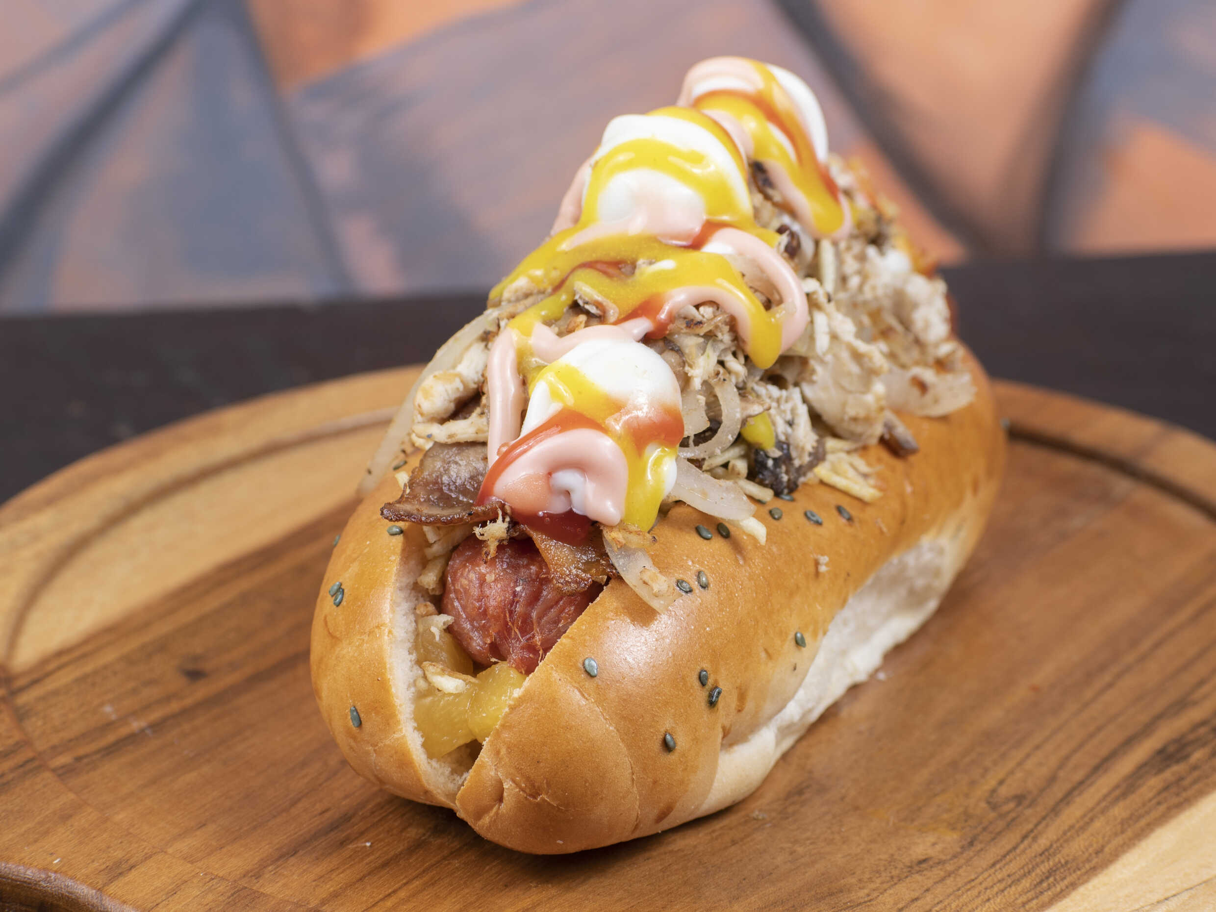 Pan artesanal tipo brioche bañado en ajonjoli negro en medio una salchicha americana, queso mozzarella, papa chip, cebolla, piña, pollo desmechado y huevo de codorniz, tocineta y champiñon.