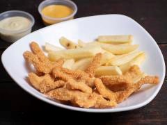 Crocantes deditos de pollo acompañado de papita a la francesa y dos de nuestras deliciosas salsas de la casa a elección.