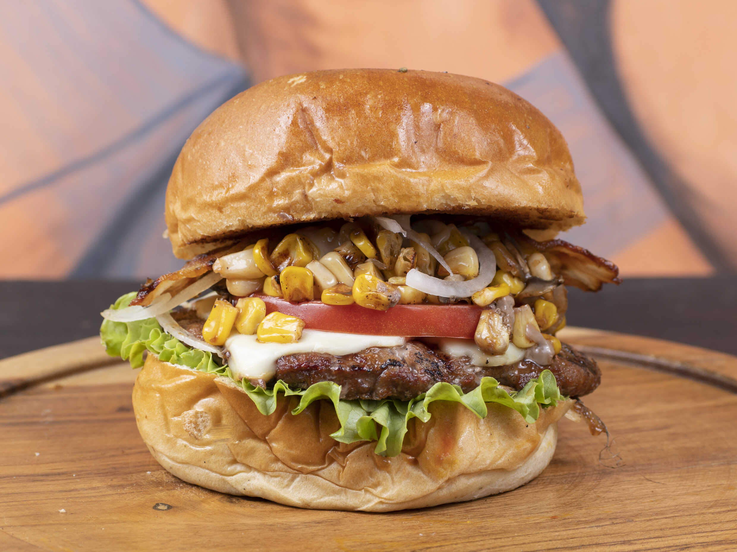Pan artesanal tipo brioche bañado en ajonjoli negro, queso mozzarella, mazorca, champiñon, cebolla saldeada en BBQ, tocineta, todo esto bañado en nuestra deliciosa salsa de la casa, tomate, y lechuga fresca.