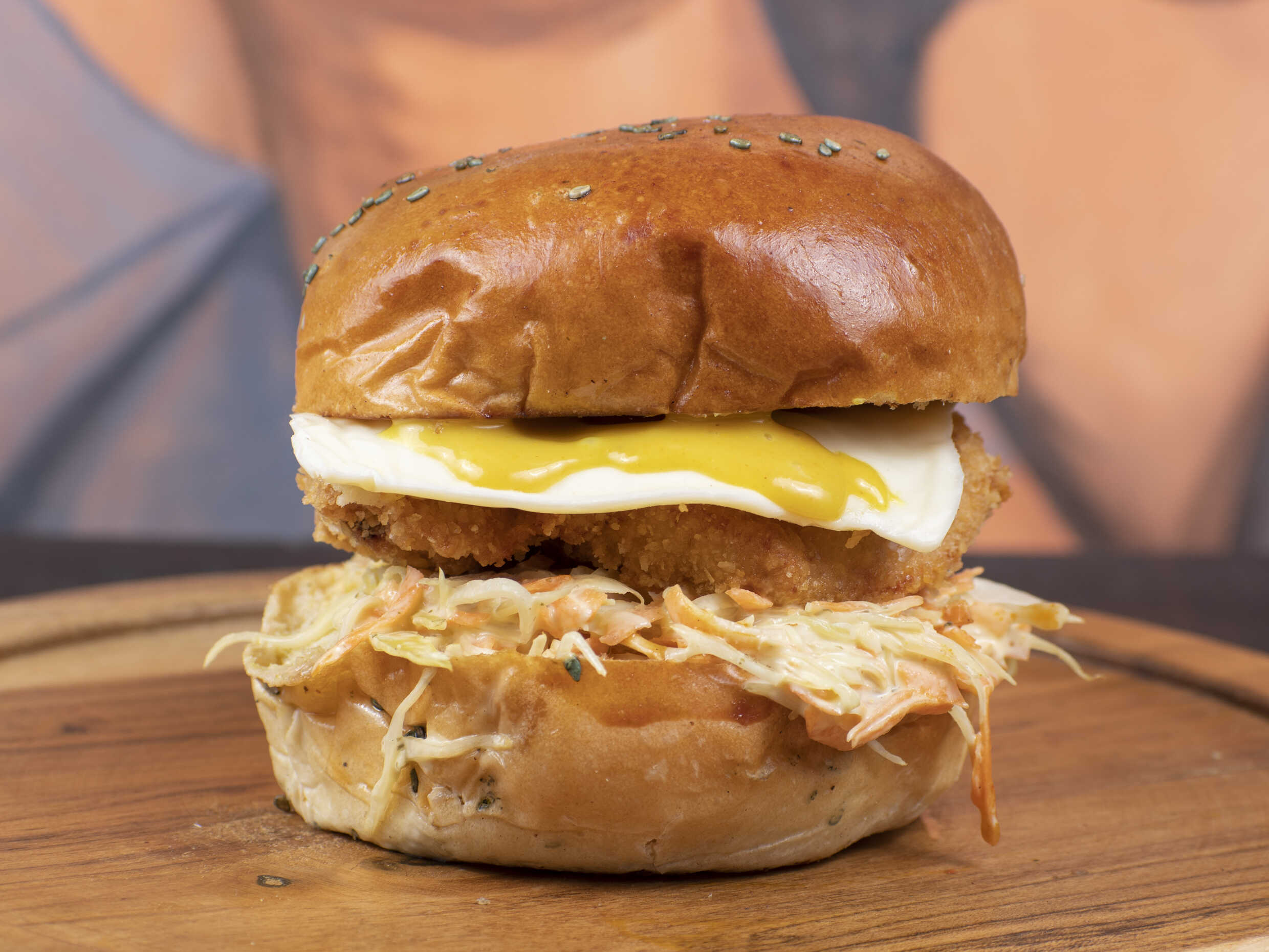 Pan artesanal tipo brioche bañado en ajonjolí negro, Pollo apanado, queso mozzarella, una deliciosa ensalada coleslaw y un baño de miel.