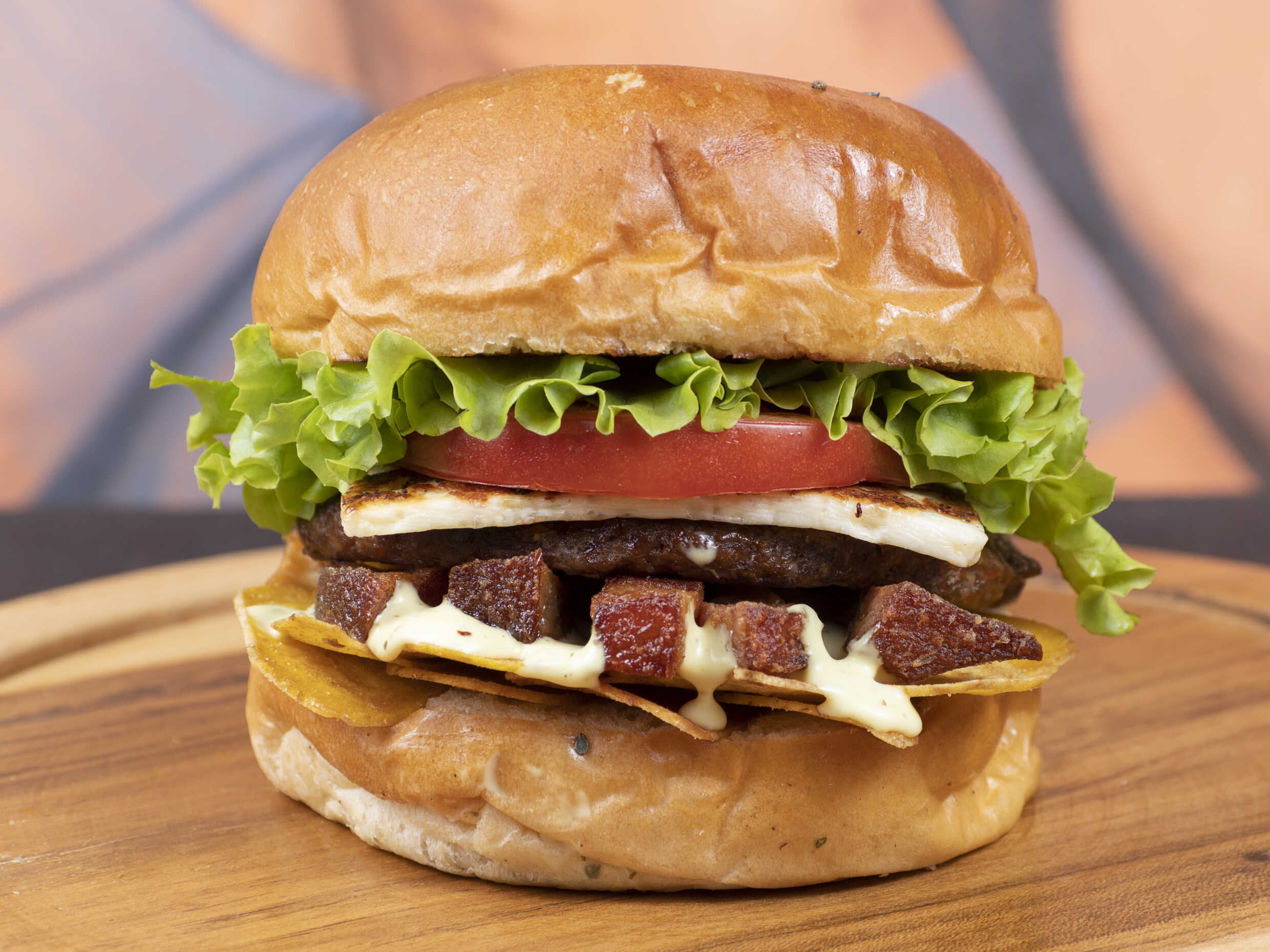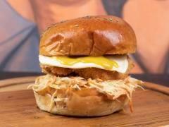 Pan artesanal tipo brioche bañado en ajonjoli negro, queso asado, chicharron crocante, chips de patacon, bañada en un delicioso suero consteño, salsa de la casa, tomate y lechuga fresca.