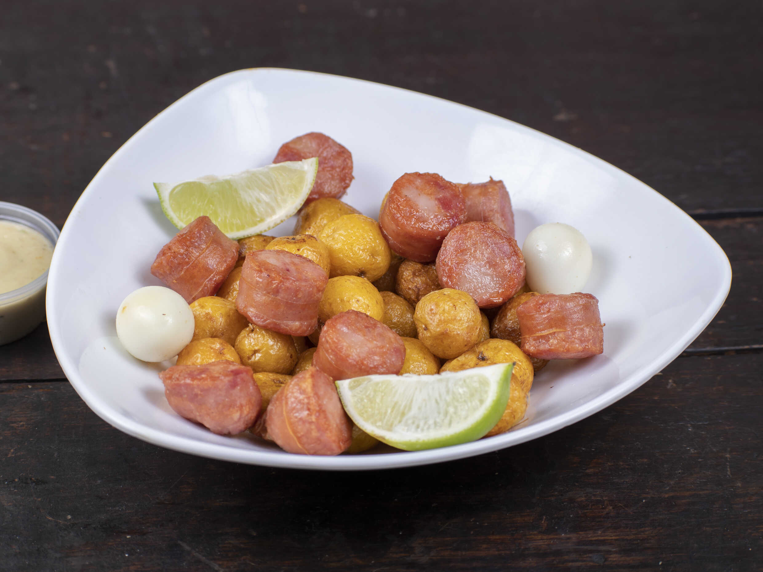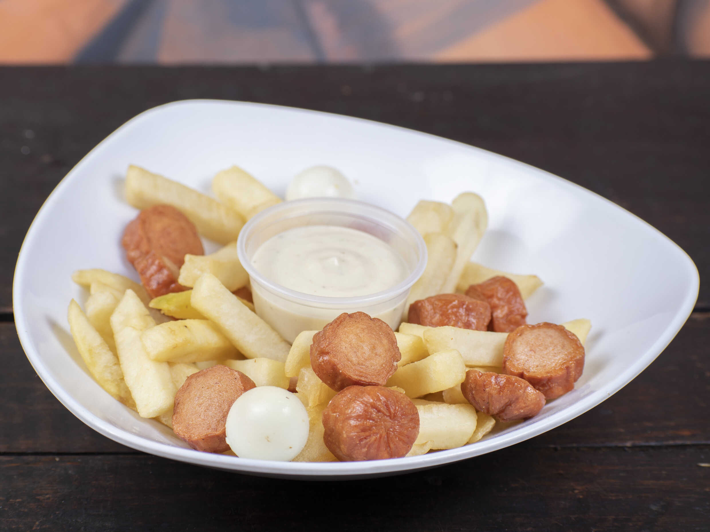 Salchicha americana acompañado de papita francesa, huevos de codorniz, y nuestra salsa de la casa.
