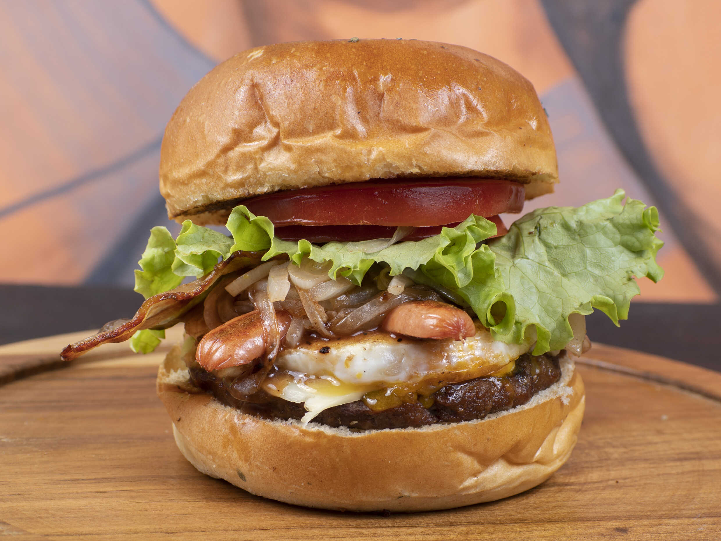 Pan artesanal tipo brioche bañado en ajonjoli negro, queso mozzarella, tocineta, salchicha ranchera,huevo frito, baño arriba y debajo de nuestra salsa BBQ,cebolla saldeada en BBQ, tomate, y lechuga fresca.