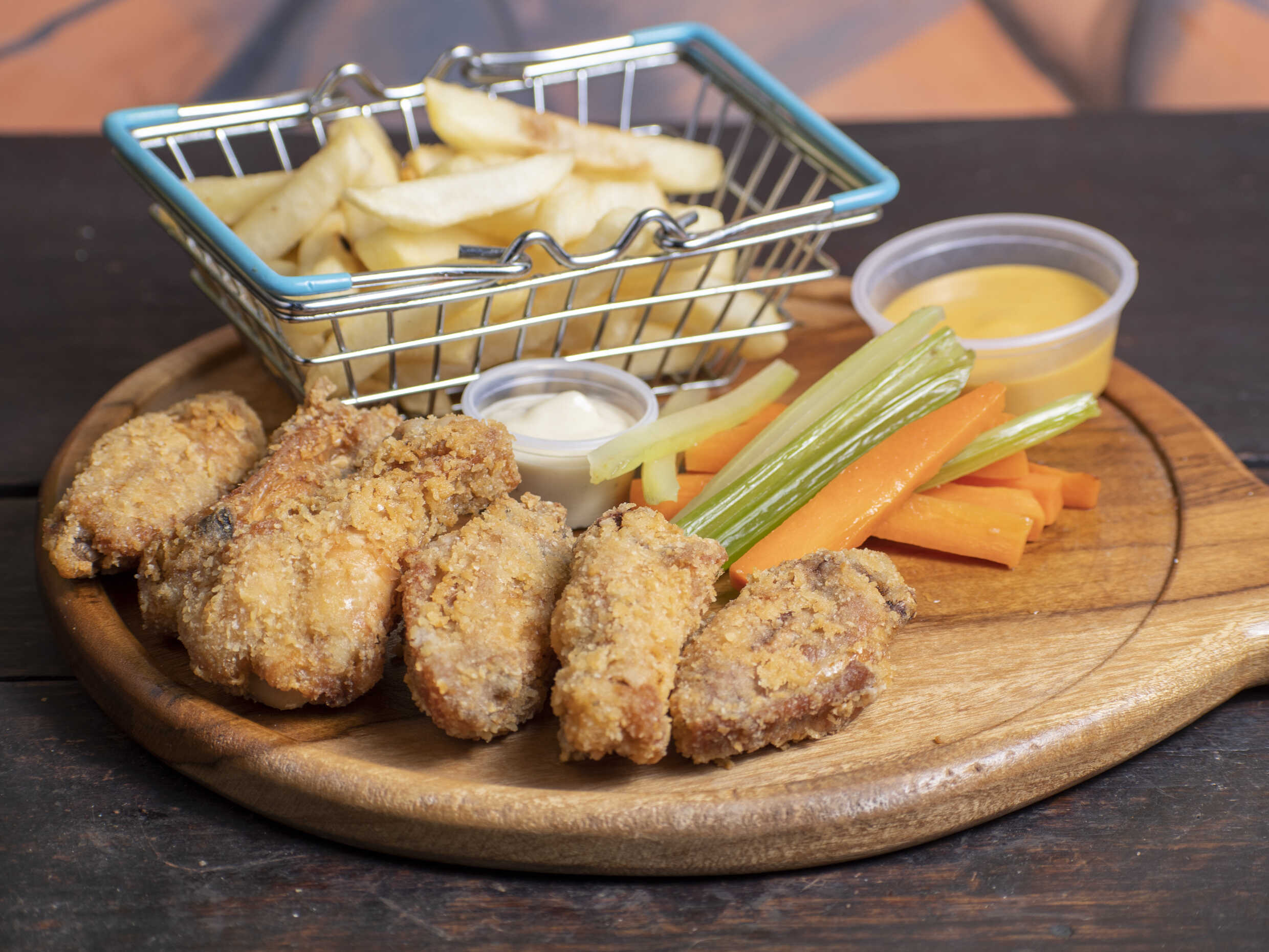 6 piezas de alitas apanadas acompañada de papita a la francesa, apio, zanahoria y dos de nuestras deliciosas salsas de la casa a elección.