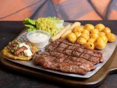 Acompañado de papitas a elección, yuquita en astilla, quesito gratinado en mazorca y champiñón sobre churrasco, guacamole, salsas de la casa y nuestra deliciosa entrada de pico de gallo, patacón crocante, chicharrón y suero costeño 300 g. y Limonada Natural