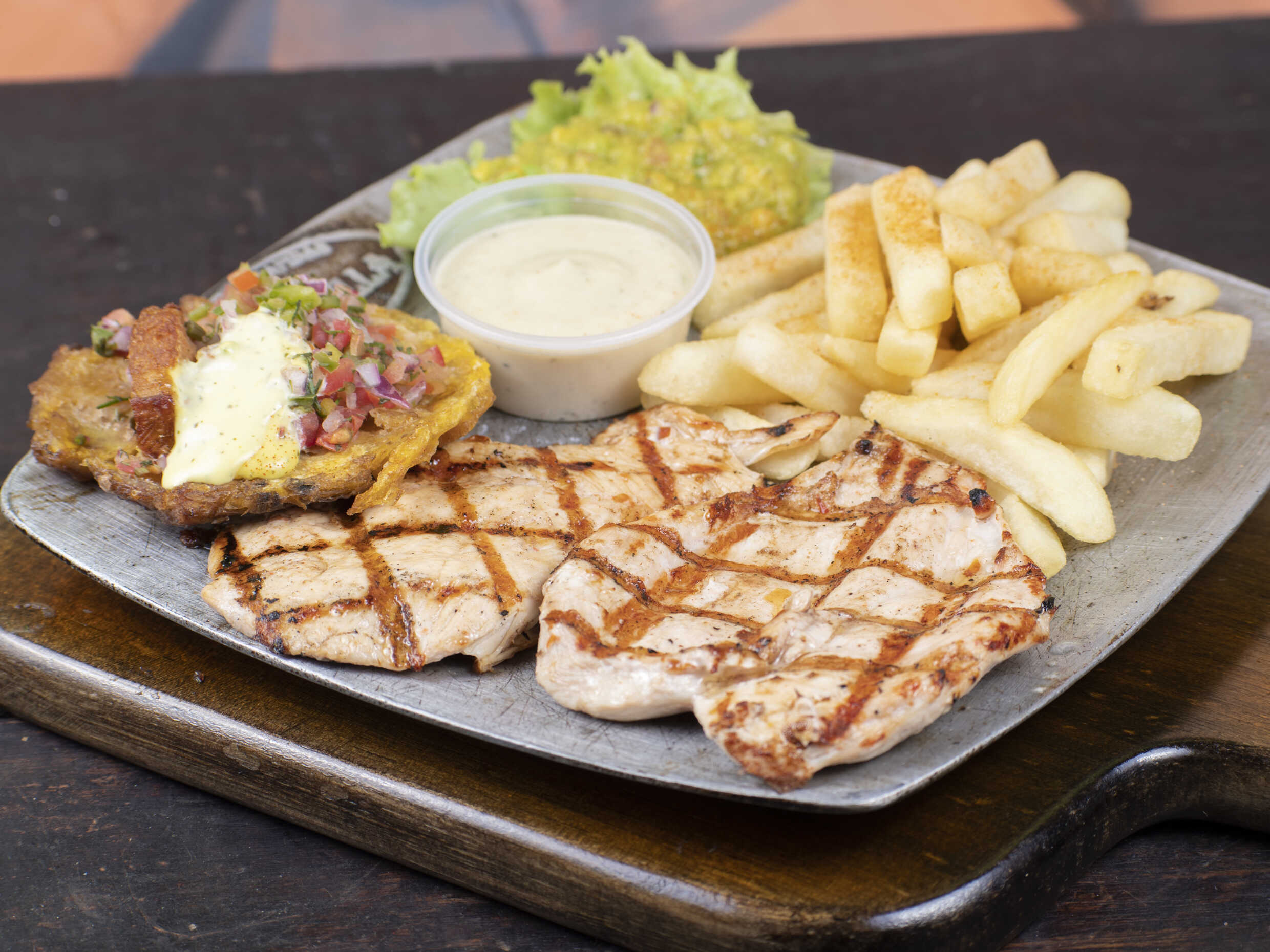 200 g de pechuga acompañado de papitas francesas, queso gratinado, guacamole, salsas de la casa y nuestra deliciosa entrada de pico de gallo, patacón crocante, chicharrón y suero costeño.