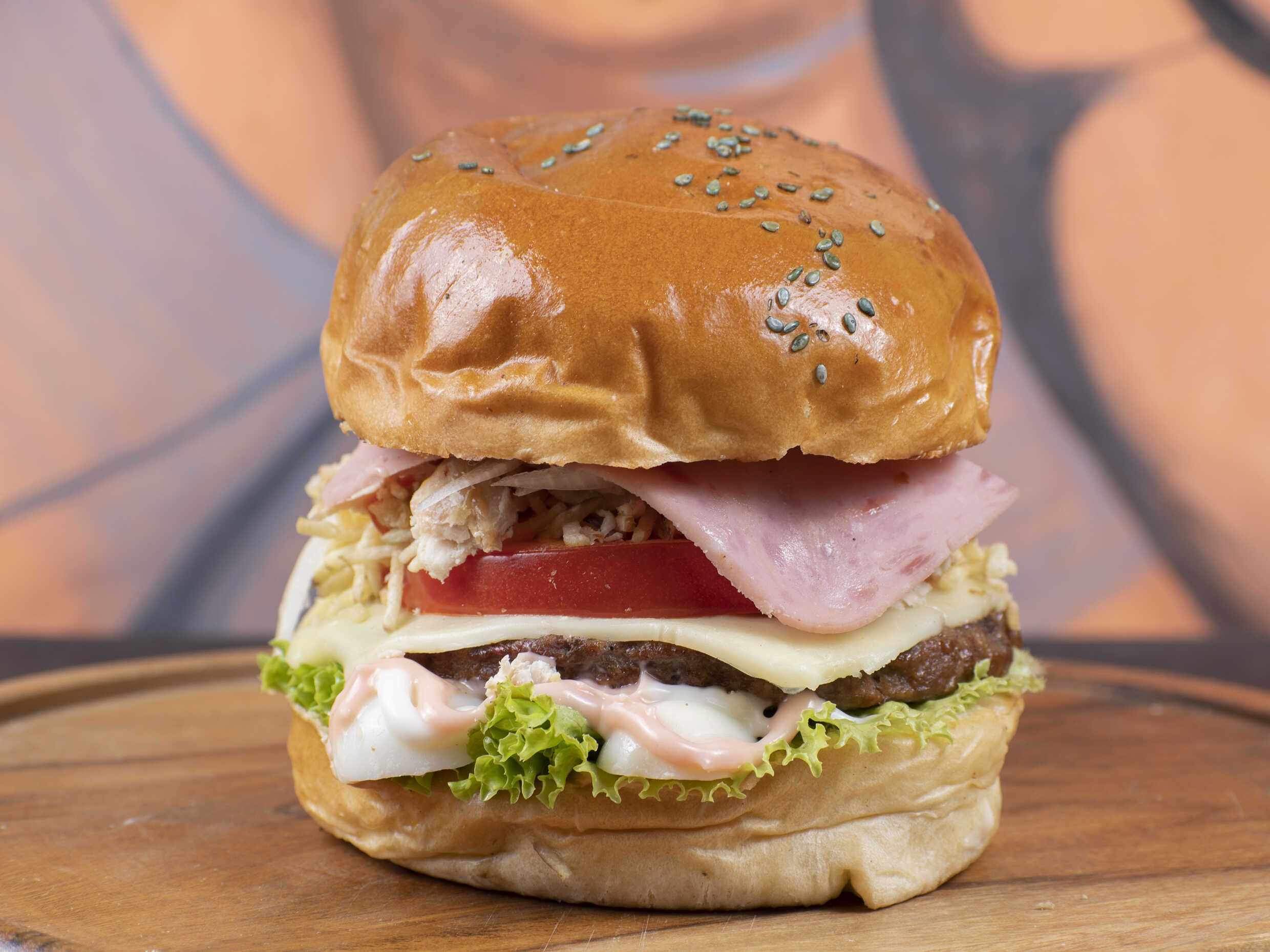 Pan artesanal tipo brioche bañado en ajonjoli negro, queso mozzarella, papa chip, pollo desmechado, huevo de codorniz, jamón, tomate, cebolla y lechuga.