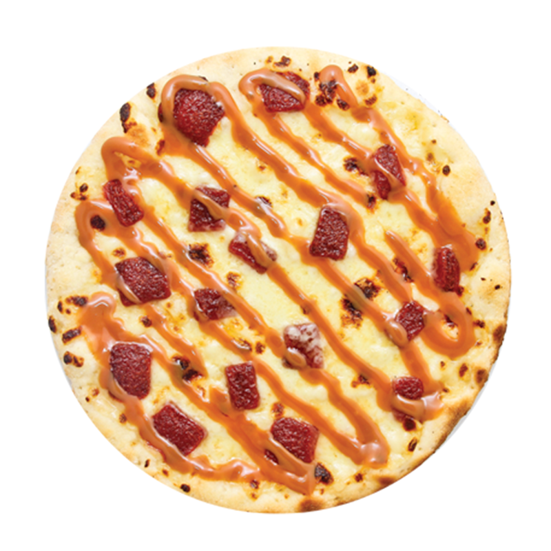 Pizza con masa madre, nutella, fresas, azúcar, pulverizada.