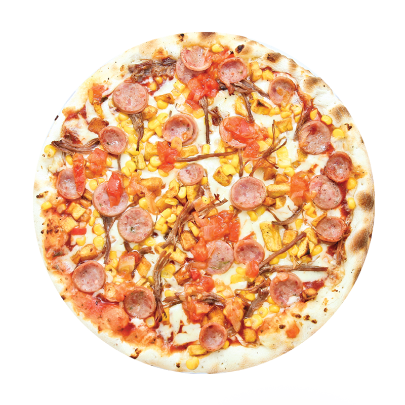 Queso, tocineta, salchicha y delicioso maíz tierno.